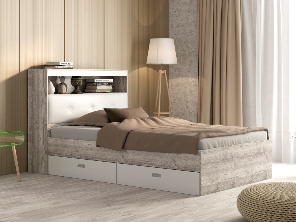 Используемый материал: ламинированное ДСП, стандартная фурнитура. В базовую комплектацию изделия входит кромка 0.4 мм . Ящик выкатной на кроватных роликах (в стандарте только с одной стороны). Ручки врезные. Мягкая панель спинки. Матрас в комплектацию изделия не входит.