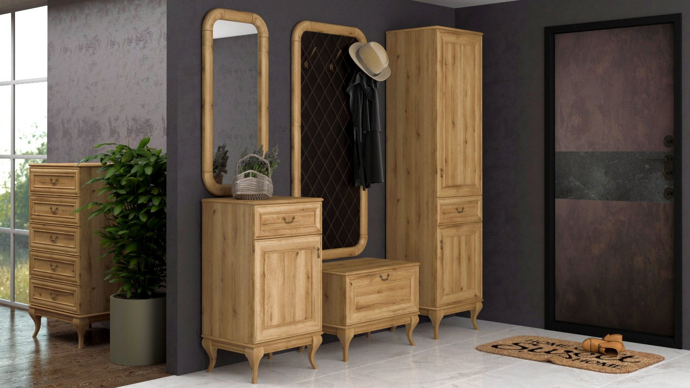 В серию входят шкафы различной ширины с бельевым и платяным отделениями, тумбы, комоды и банкетки. Оригинальным штрихом серии стал настенный щит с прострочкой в виде ромбов. Темная обивка цвета «антик коричневый» выигрышно подчеркивает оттенок «золотистого дуба», выбранный для оформления мебельных фасадов.