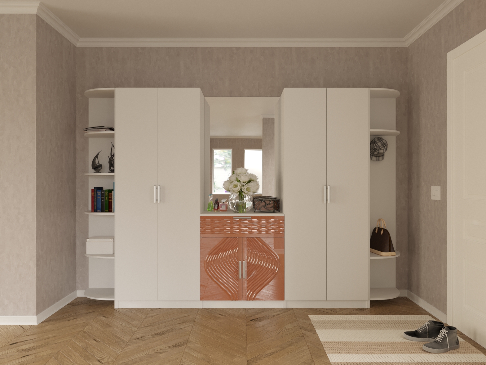 Используемый материал: корпус ламинированное ДСП; фасады комбинированные: ЛДСП/рельефный МДФ 3Д, ДВП, зеркало, стандартная фурнитура