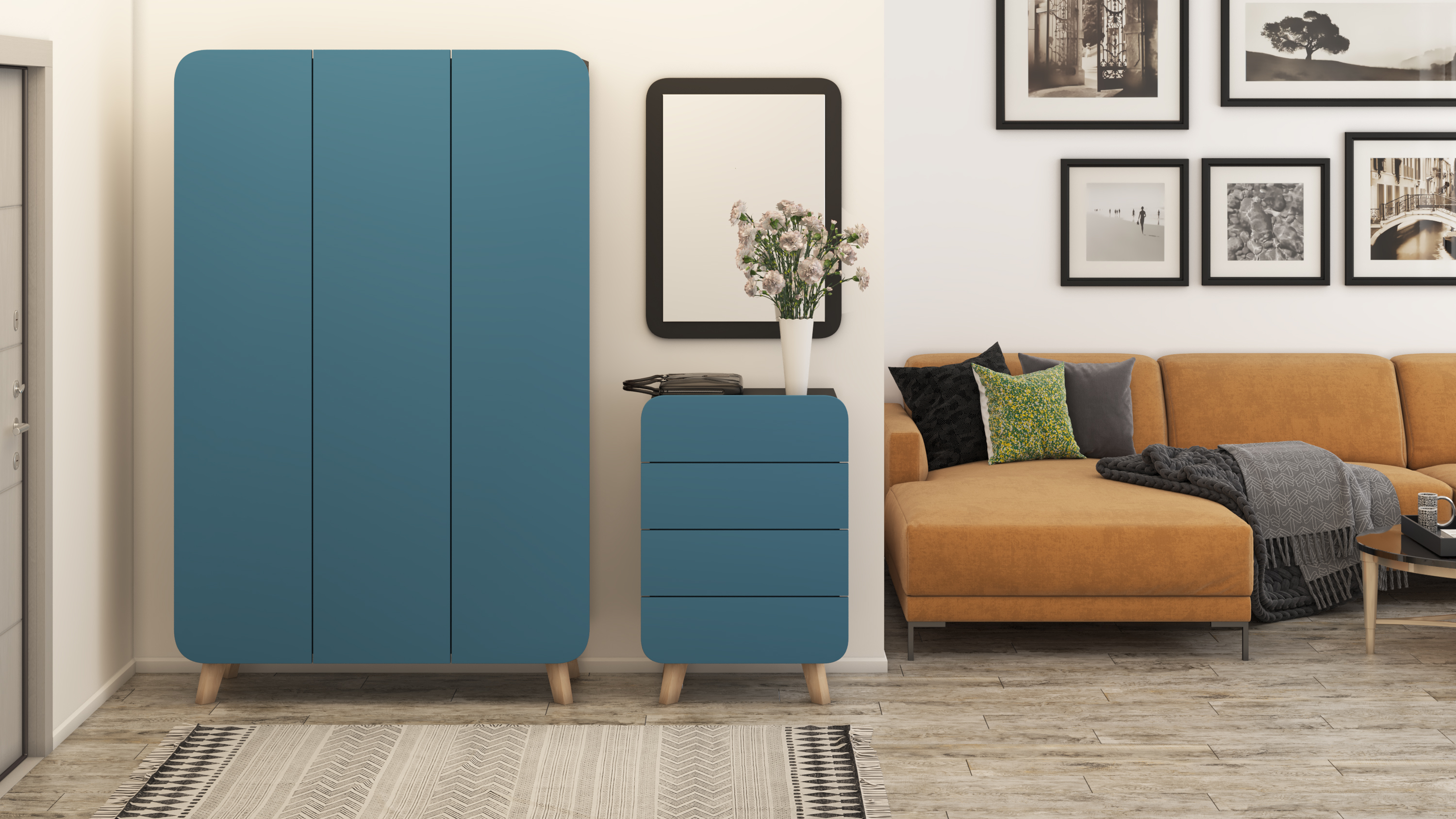 Используемый материал: корпус ЛДСП. Фасад МДФ в пленке ПВХ. Комод 4 выдвижных ящика на направляющих 100% полного выдвижение. Открытие по нажатию push to open. Шкаф: наполнение: 2/3 - платье (полка под шляпы, выдвижная штанга, полка под обувь)/1/3 - белье (4 полки).Открытие по нажатию push to open. Ножки бук, высотой 150 мм