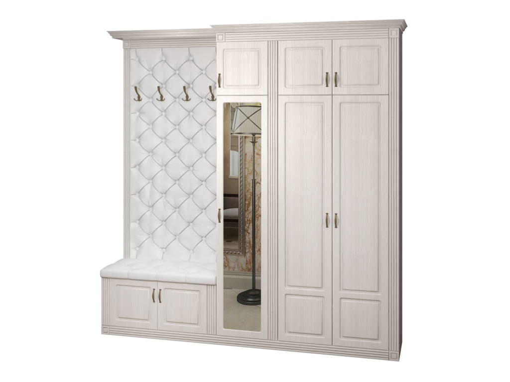 Используемый материал: корпус - ламинированное ДСП 16 мм; зеркало; фасады, карниз и пилястры - МДФ; ЛДВП. Мягкая панель декорирована каретной стяжкой. Доступен выбор вариантов ткани для обивки: это может быть велюр, рогожка или экокожа различных цветов.