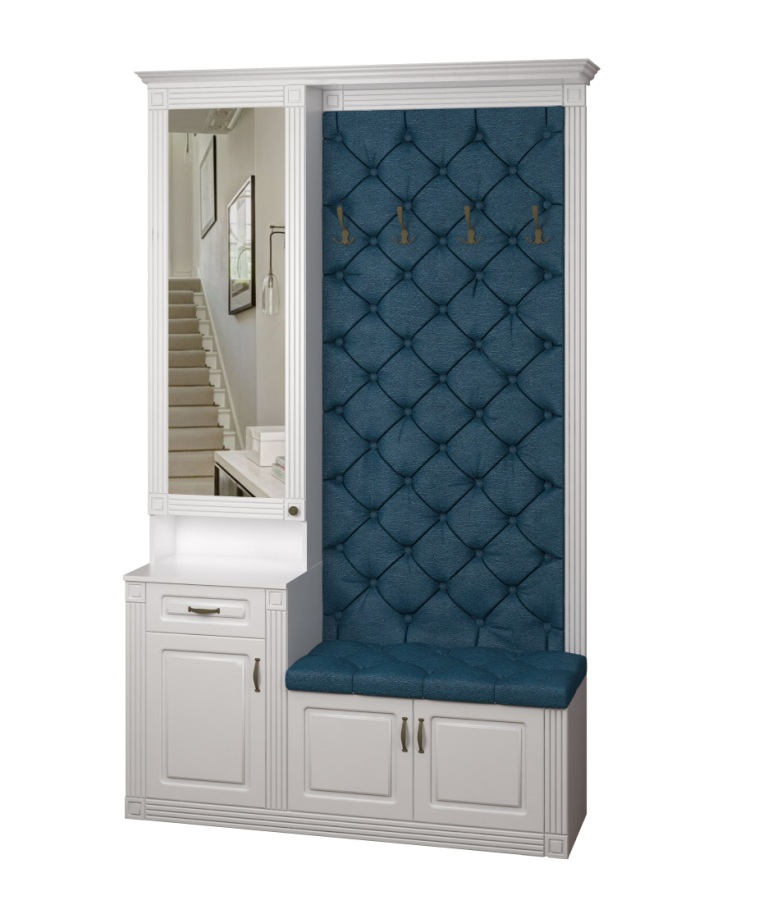 Используемый материал: корпус - ламинированное ДСП 16 мм; зеркало; фасады, карниз и пилястры - МДФ; ЛДВП. Мягкая панель декорирована каретной стяжкой. Доступен выбор вариантов ткани для обивки: это может быть велюр, рогожка или экокожа различных цветов.