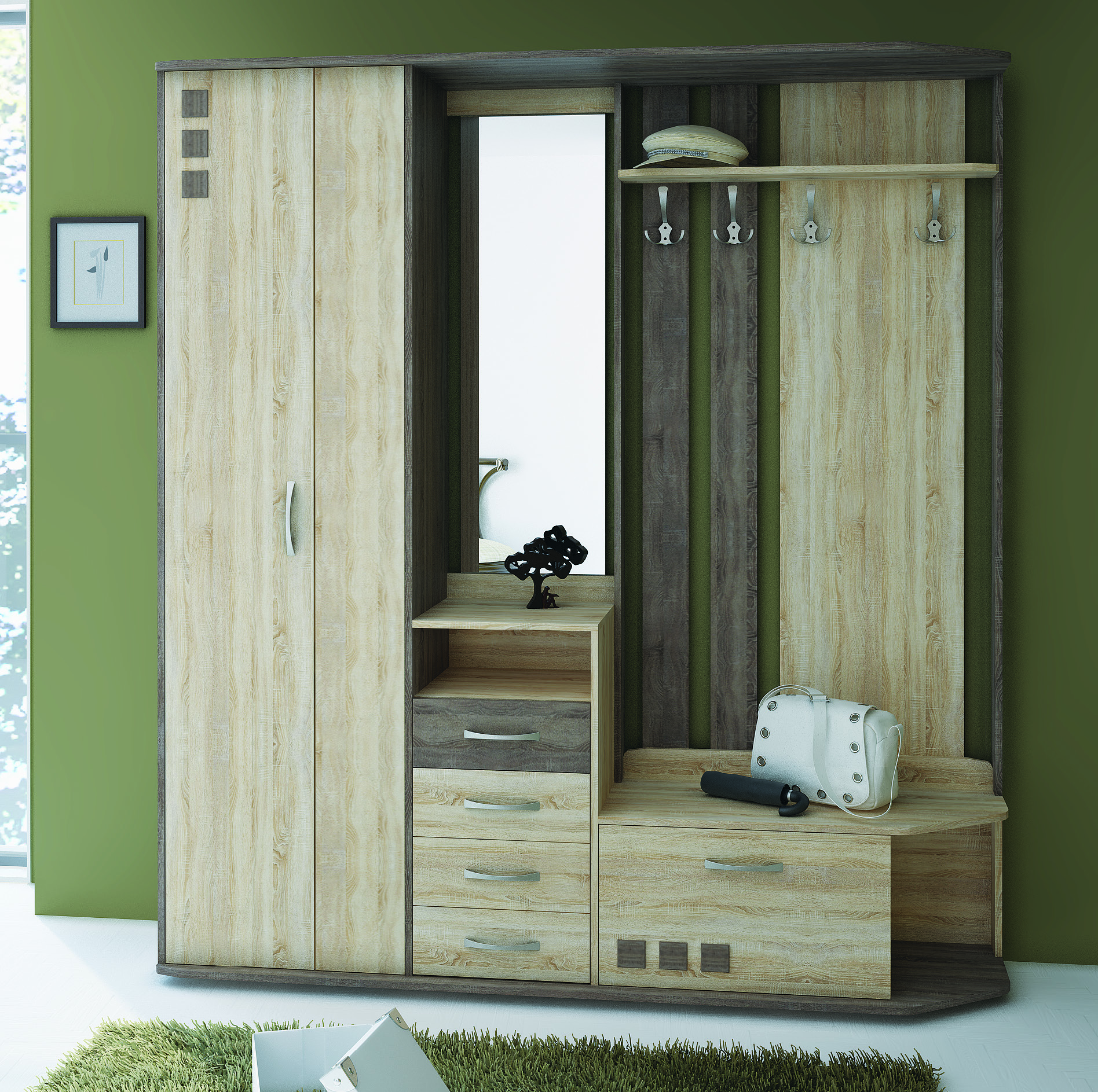 Вместительный платяной шкаф, стойка с открытой вешалкой и полкой для головных уборов, обувная тумба-пуф, небольшой комод и зеркало. Светлые фасады оттенка «ель» гармонично контрастируют с вставками модного цвета «дуб стерлинг». Удобные ручки, много места для хранения, долговечные материалы – всё это делает мебель для прихожей не только эстетически привлекательной, но и эргономичной.