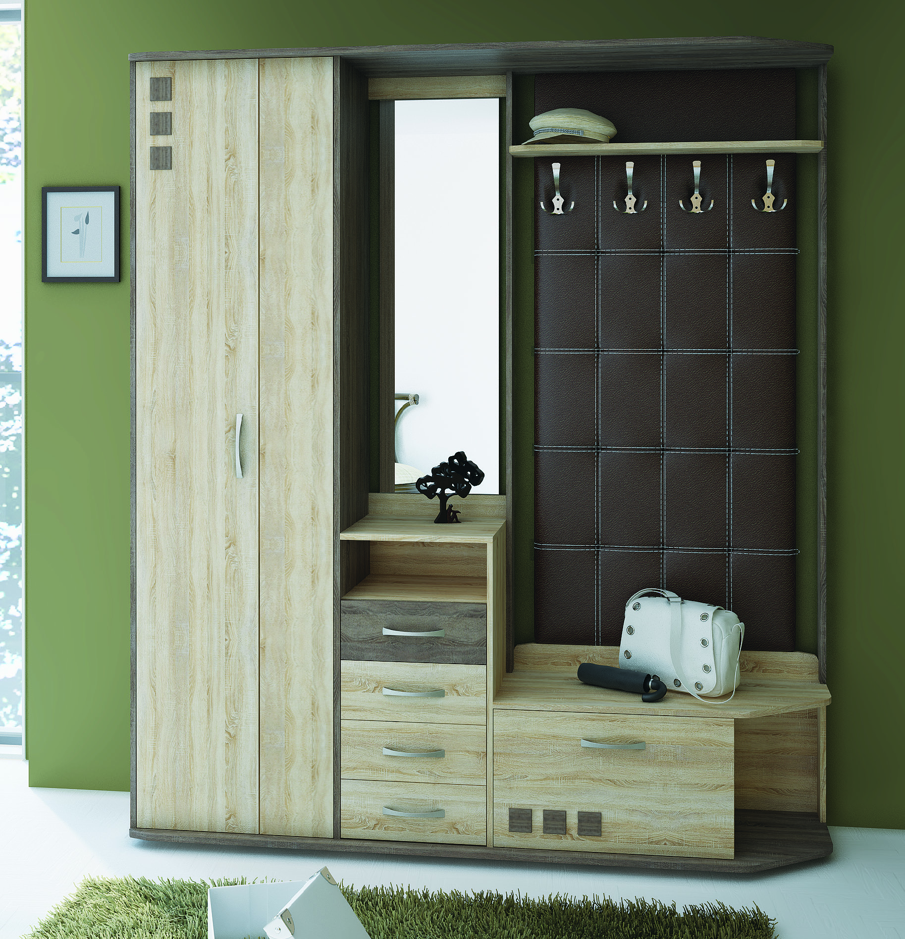 Высокий платяной шкаф в ней дополнен узким комодом и обувной тумбой, которую можно использовать в качестве пуфа во время переобувания. Стойка с 4 вешалками и открытой полкой декорирована темно-коричневым кожзамом, который выигрышно контрастирует с основным цветом фасадов оттенка светлой «ели». Распашные створки и выдвижные ящики оснащены удобными металлическими ручками. Логичным дополнением комплекта становится узкое зеркало.