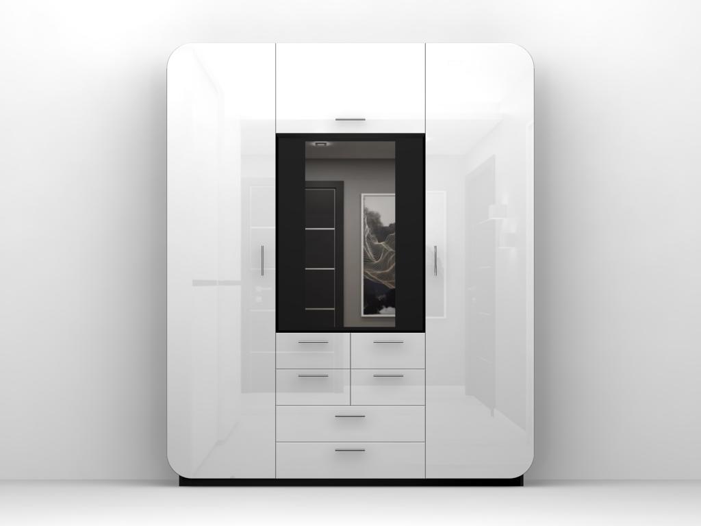 Стандартное внутреннее наполнение: шкаф для платья ширина 500 мм (полка под обувь + полка под шляпу + выдвижная штанга); шкаф для белья, ширина 500 мм (4 полки), 6 выдвижных ящиков. Антресольная дверь открывается вверх на газ лифтах.