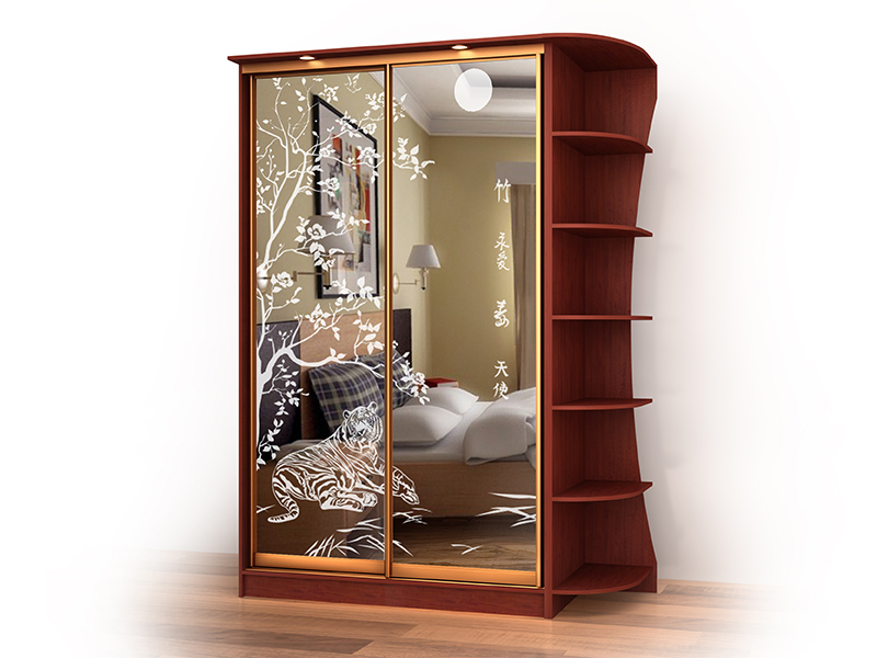 Используемый материал: корпус - ламинированное ДСП 16 мм, ламинированное ДВП; фасады - полностью алюминиевая конструкция люкс - Версаль (периметр каждого фасада в алюминиевом профиле - ручке), вставка - зеркало с пескоструйным рисунком.