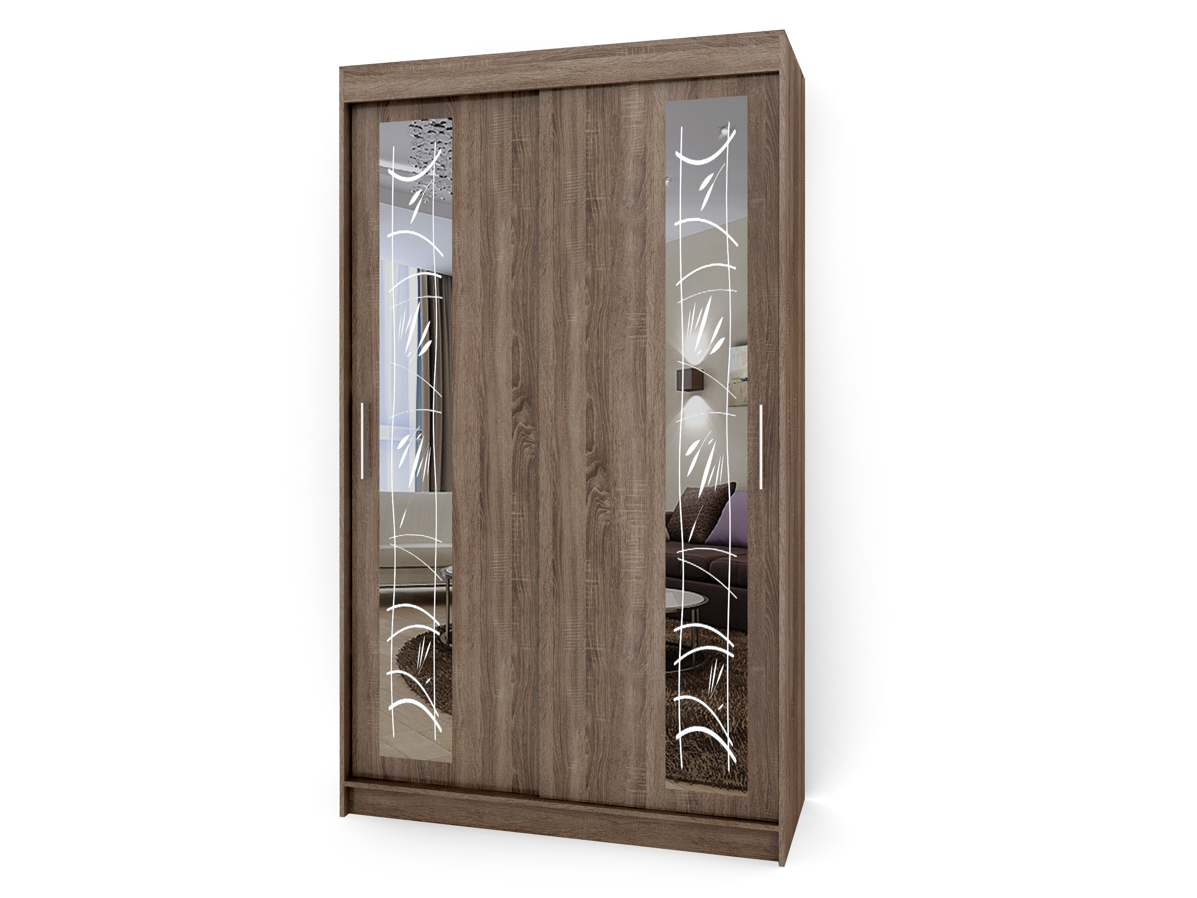 Используемый материал: ламинированное ДСП 16 мм, ламинированное ДВП, выбор направляющих от "эконом" до класса "люкс", ручки рейлинг, зеркало с рисунком. Стандартно для шкафа установлена бюджетная система направляющих дверей - Топ-лайн (колесо только наверху, внизу паз-кораблик). За дополнительную плату можно установить усиленную систему направляющих - Альянс (колеса внизу и вверху), особенно это рекомендуется для шкафов высотой более 2200 мм.