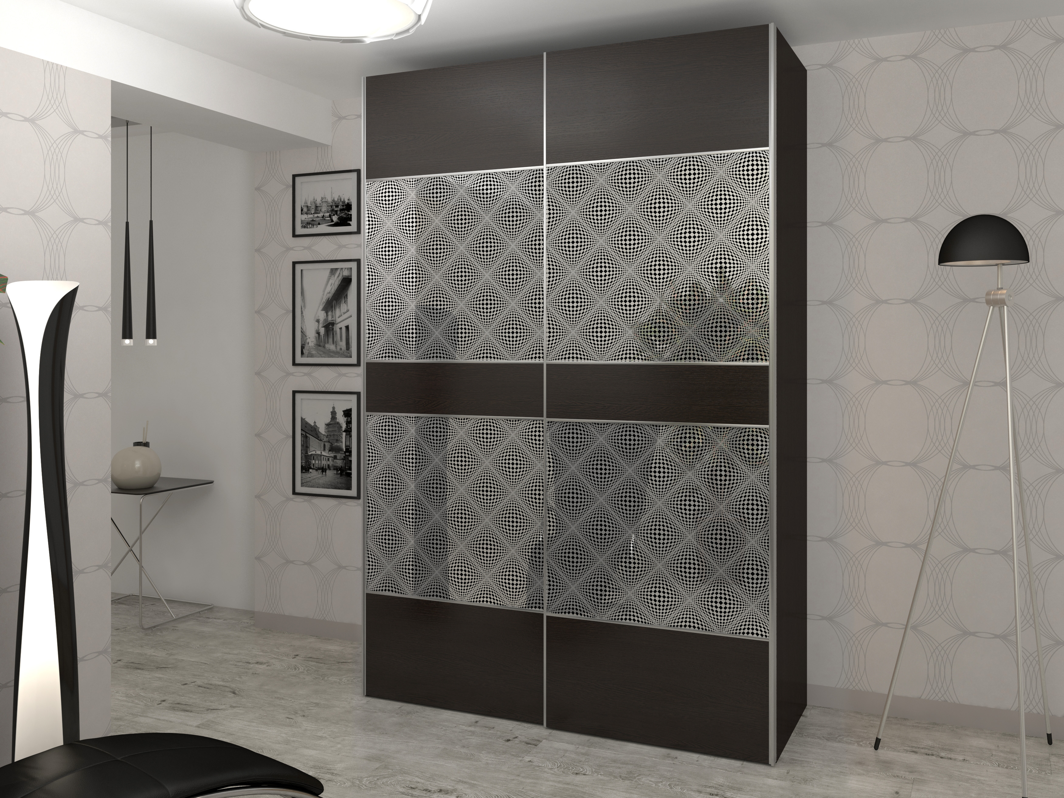 Используемый материал: корпус - ламинированное ДСП, ЛДВП, система направляющих "Реал" (один из видов верхнеподвесной системы премиум-класса с алюминиевыми профилями, отличающаяся бесшумностью и плавностью хода. Система создает впечатление «парящих» дверей, в связи с чем шкаф не выглядит тяжеловесным), профиль серебро, зеркало с рисунком, кромка 0,4 мм