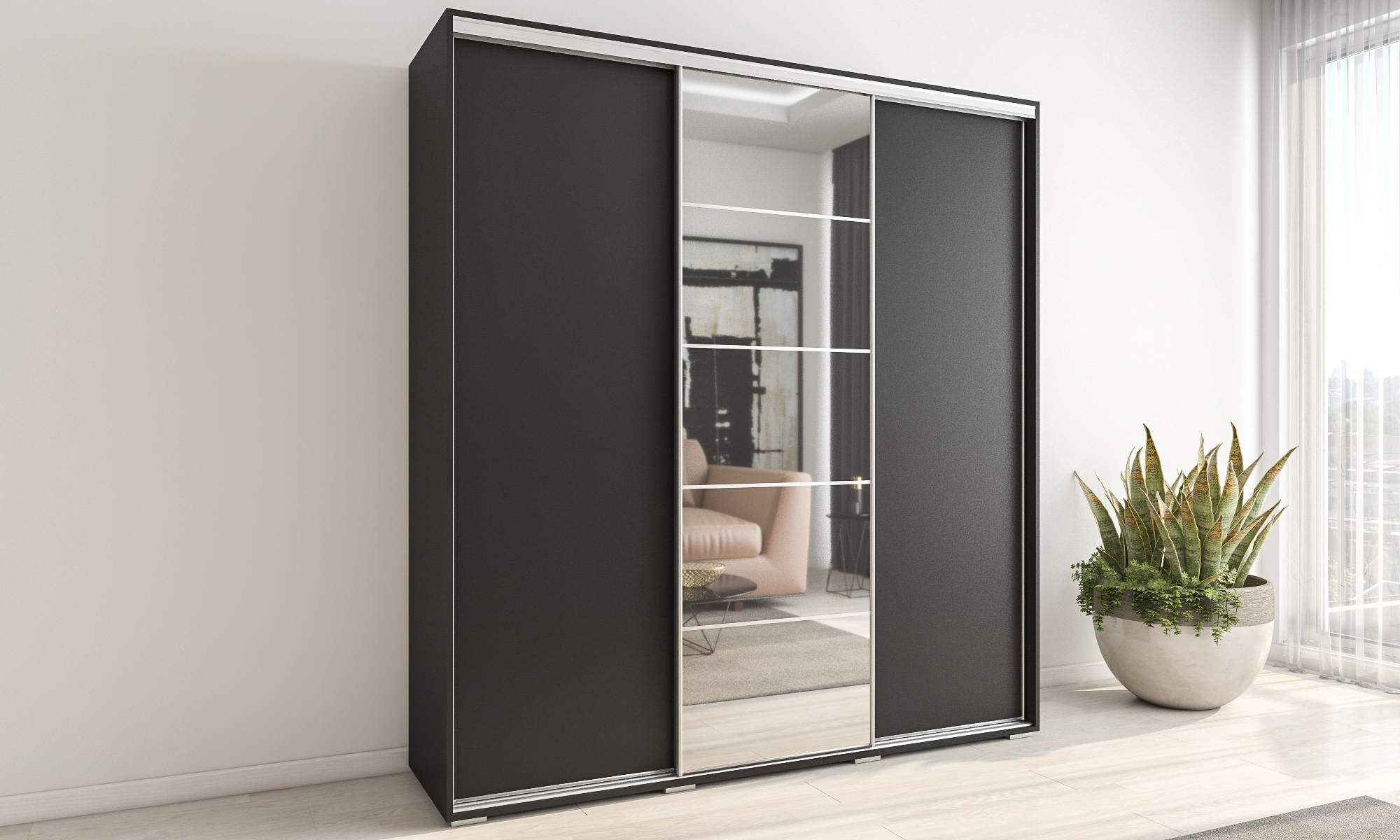 Шкаф купе 3-х дверный "Модус-18" купить недорого в МосквеИспользуемый материал: ламинированное ДСП 16 мм, ламинированное ДВП, система алюминиевых направляющих "Modus", зеркало