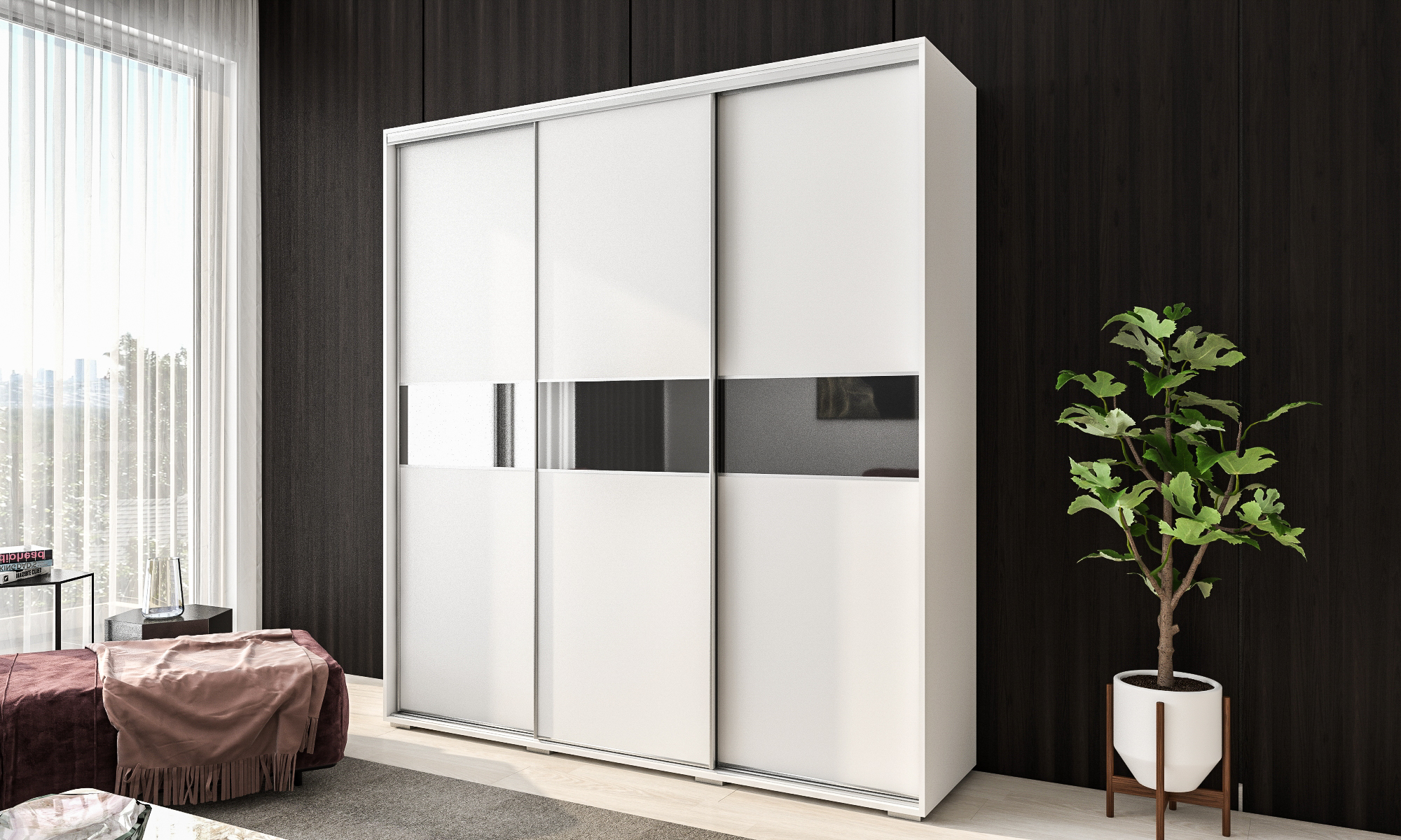 Шкаф купе 3-х дверный "Модус-22" купить недорого в МосквеИспользуемый материал: ламинированное ДСП 16 мм, ламинированное ДВП, система алюминиевых направляющих "Modus", вставки на фасадах цветное стекло оракал