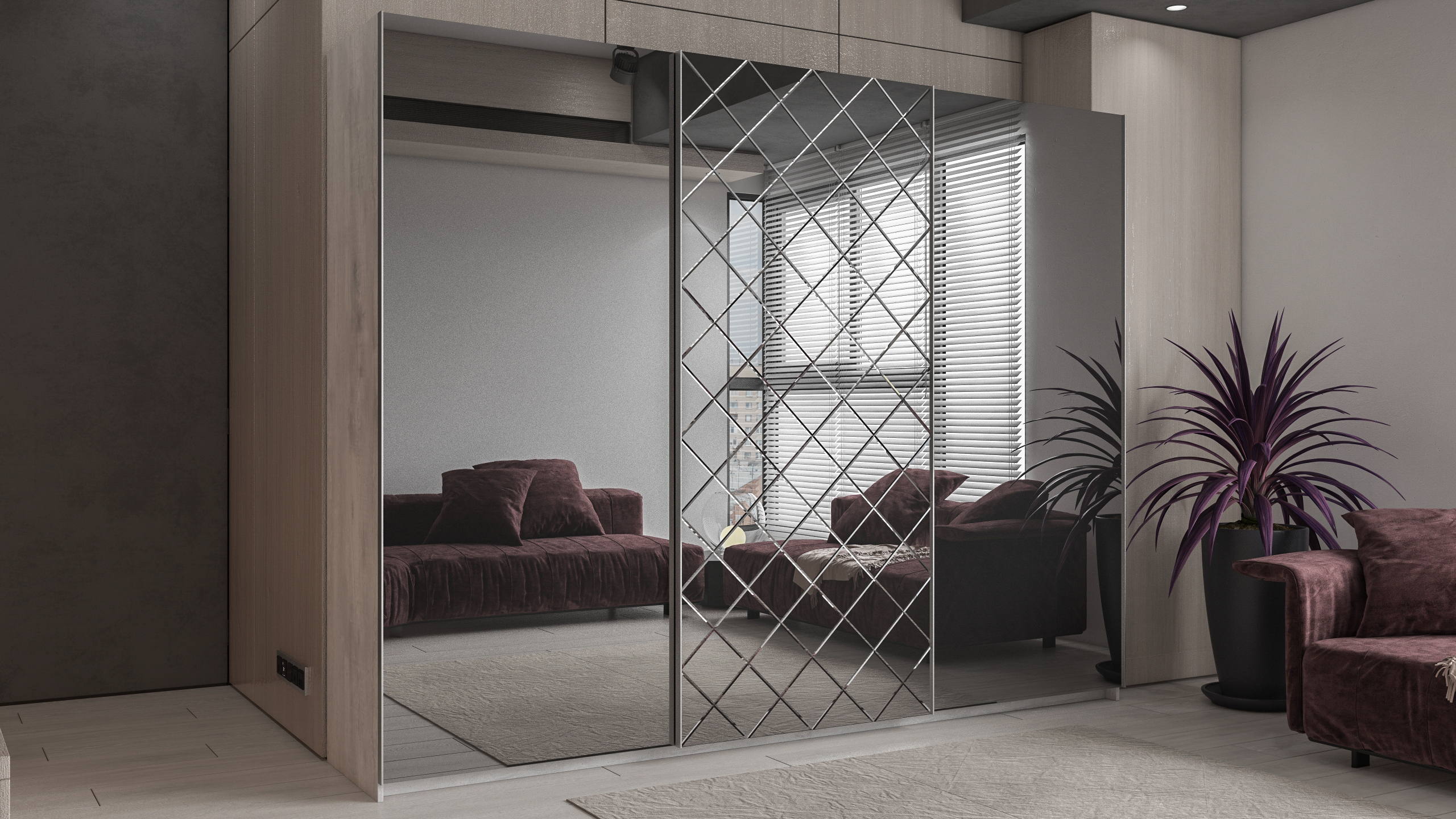 Используемый материал: ламинированное ДСП 16 мм, ламинированное ДВП, система алюминиевых направляющих "One", зеркало