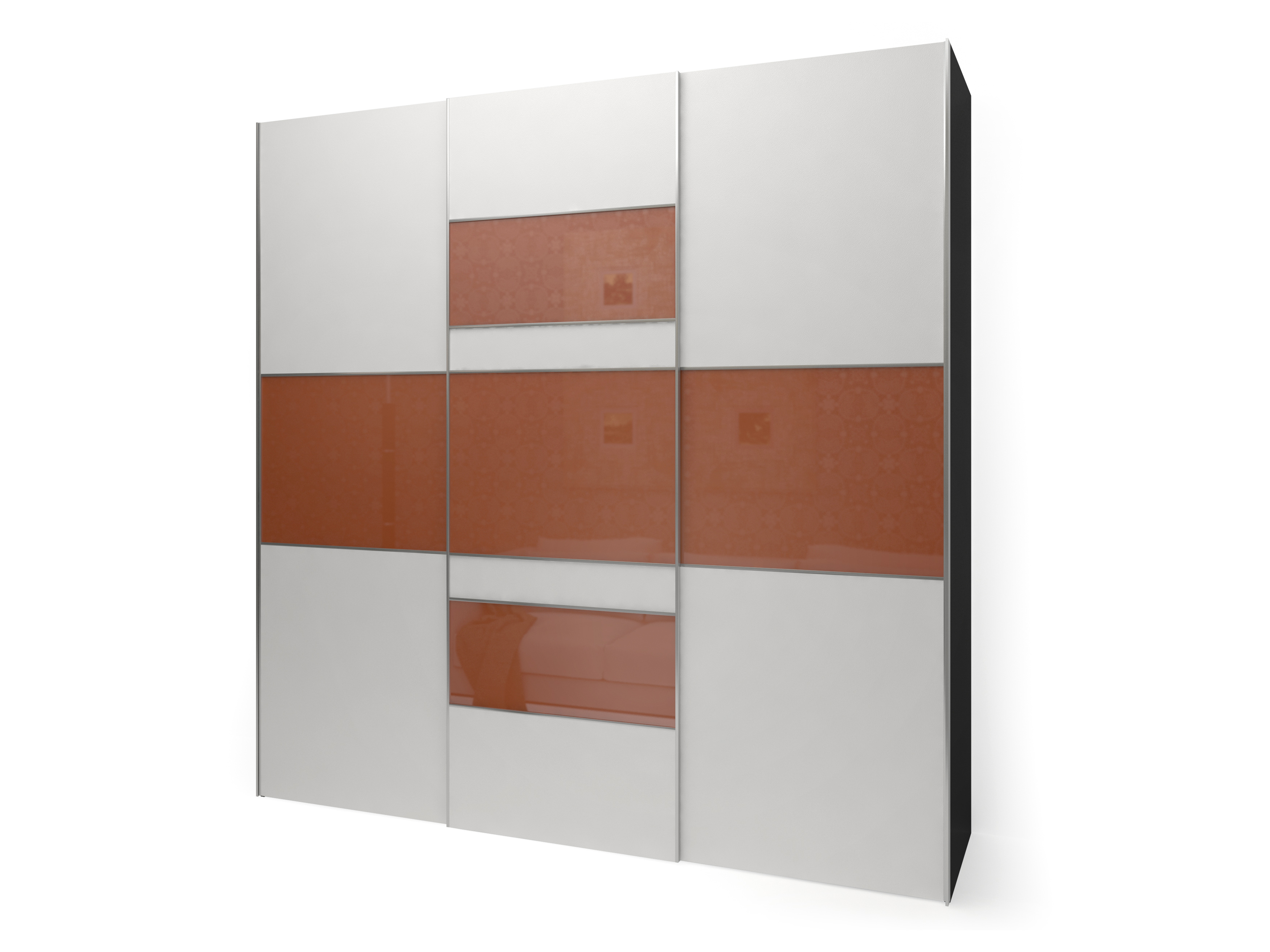 Используемый материал: ламинированное ДСП, вставка - стекло, ЛДВП, система направляющих "Реал", профиль серебро, кромка 0,4 мм.