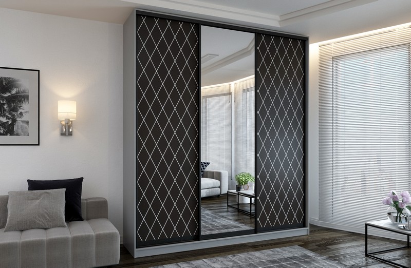 В базовую комплектацию шкафа входит ламинированное ДСП - 16 мм (фасады - ЛДСП в пленке - фотопечать), ламинированное ДВП, система алюминиевых направляющих "Версаль", зеркало.