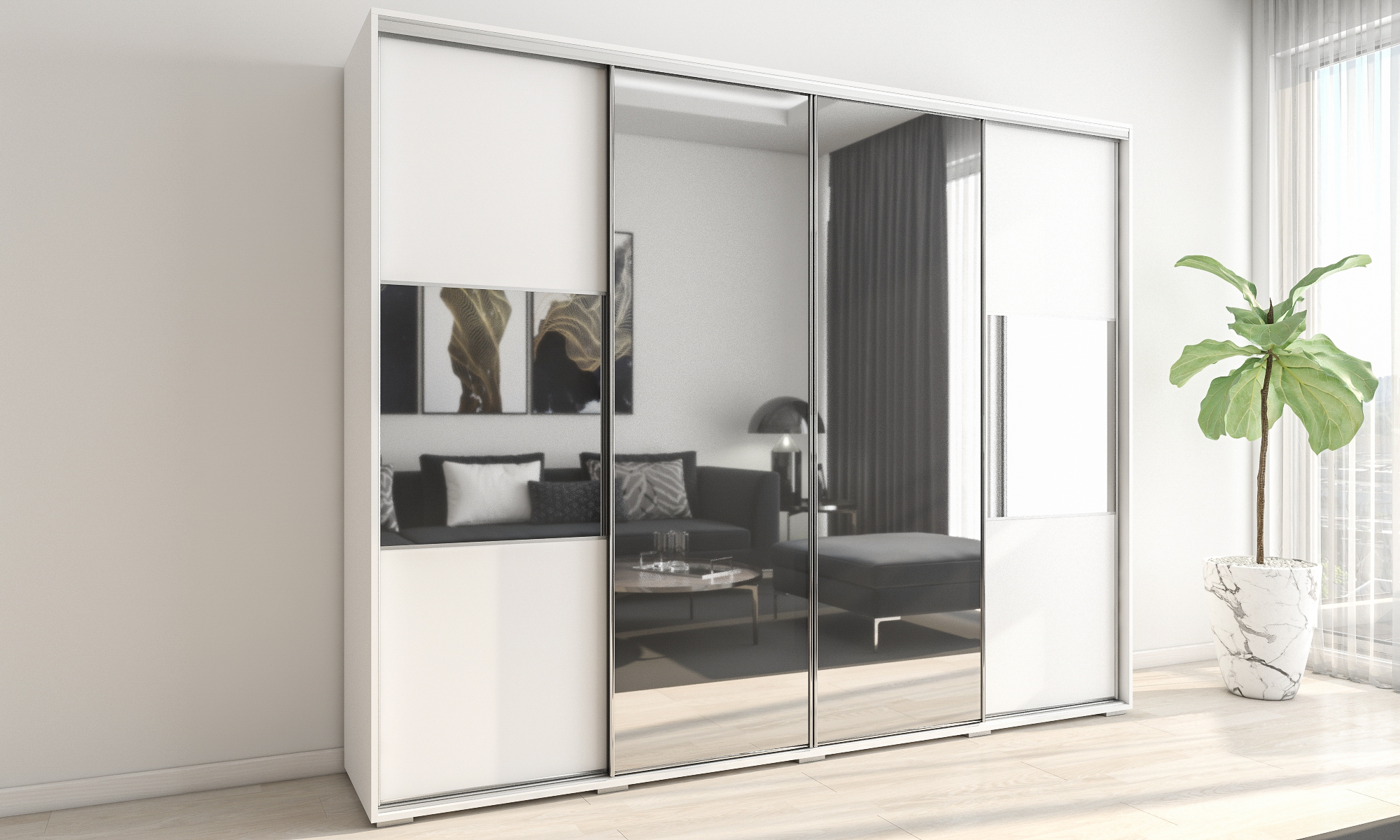 Шкаф купе 4-х дверный "Модус-23" купить недорого в МосквеИспользуемый материал: ламинированное ДСП 16 мм, ламинированное ДВП, система алюминиевых направляющих "Modus", зеркало
