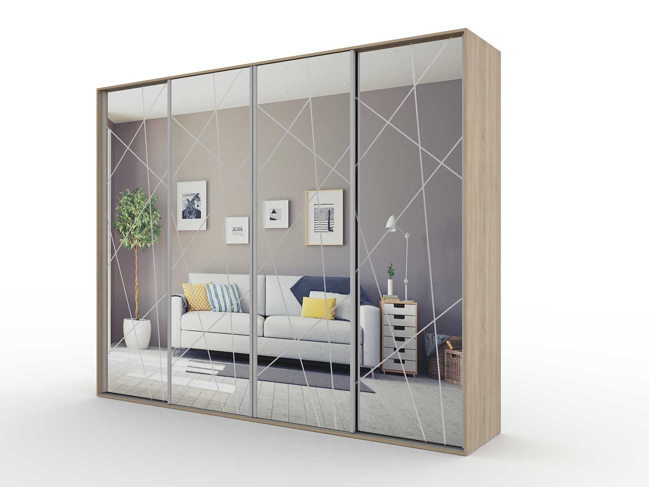 В базовую комплектацию шкафа входит кромка 0.4 мм, ручки торцевые, ламинированное ДСП 16 мм, ламинированное ДВП, направляющие Версаль, ходовые ролики РКМ-70, зеркало с пескоструйным рисунком.