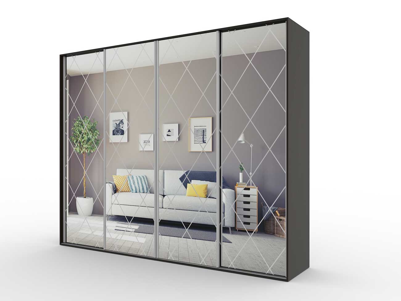 В базовую комплектацию шкафа входит кромка 0.4 мм, ручки торцевые, ламинированное ДСП 16 мм, ламинированное ДВП, направляющие Версаль, ходовые ролики РКМ-70, зеркало с пескоструйным рисунком.