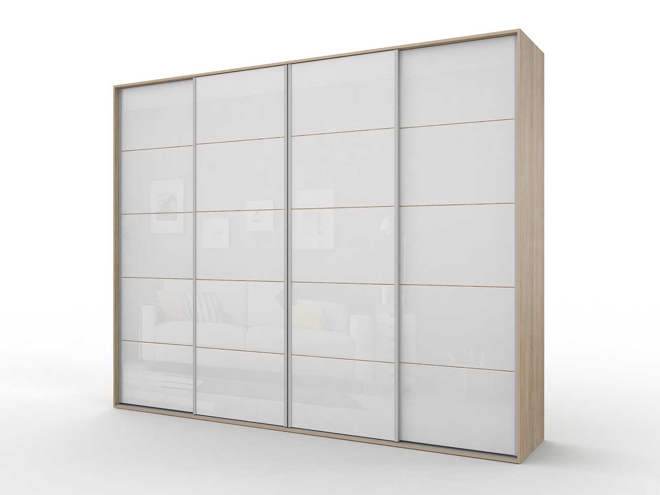 В базовую комплектацию шкафа входит кромка 0.4 мм, ручки торцевые, ламинированное ДСП 16 мм, ламинированное ДВП, направляющие Версаль, ходовые ролики РКМ-70, цветное стекло