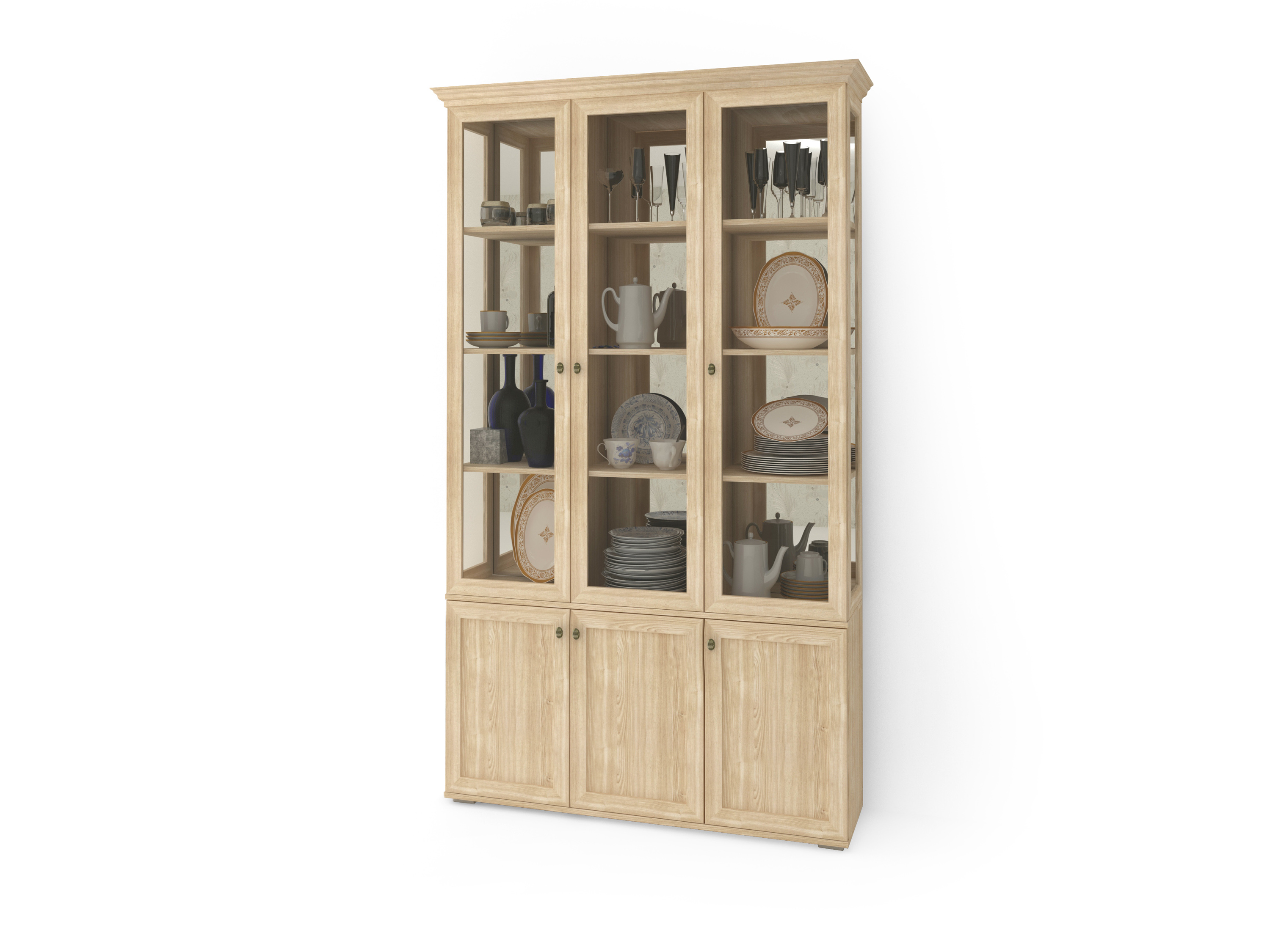 Стандартная комплектация: ламинированный ДСП, МДФ рамка, стекло, ламинированное ДВП, кромка 0,4 мм. Фурнитура стандартная: петли без доводчика. Ручки бронза по фото. На задней стенке изделия установленнны ЗЕРКАЛА. Полки ЛДСП. Высота изделия указана с учётом карниза.
