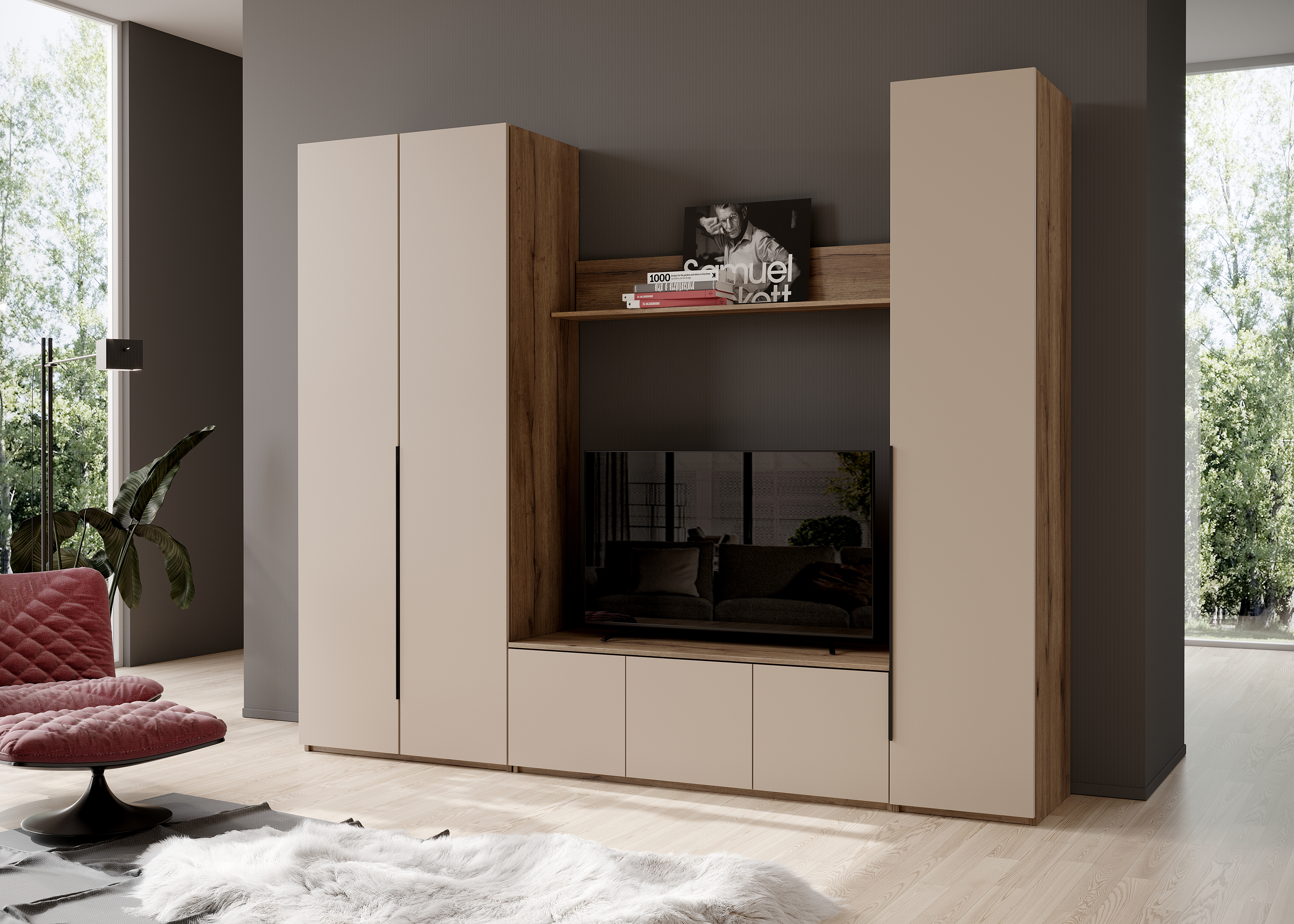Во вкладке "Выбрать модули" Вы можете подобрать различные по комплектации шкафы, тумбы, комоды. Модульная система поможет подобрать вам необходимые модули, с учетом размеров гостиной, планировки.