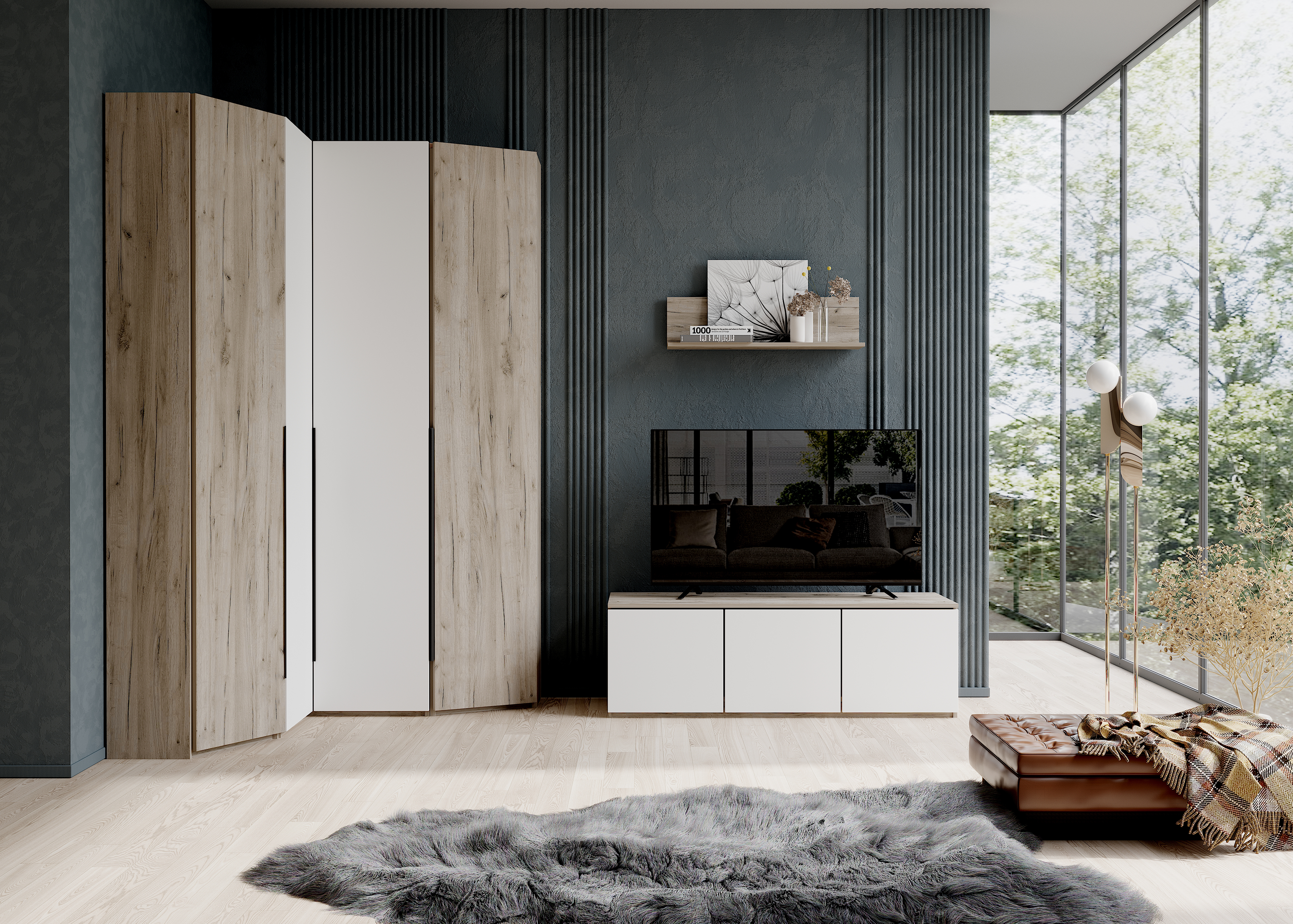 Во вкладке "Выбрать модули" Вы можете подобрать различные по комплектации шкафы, тумбы, комоды. Модульная система поможет подобрать вам необходимые модули, с учетом размеров гостиной, планировки.