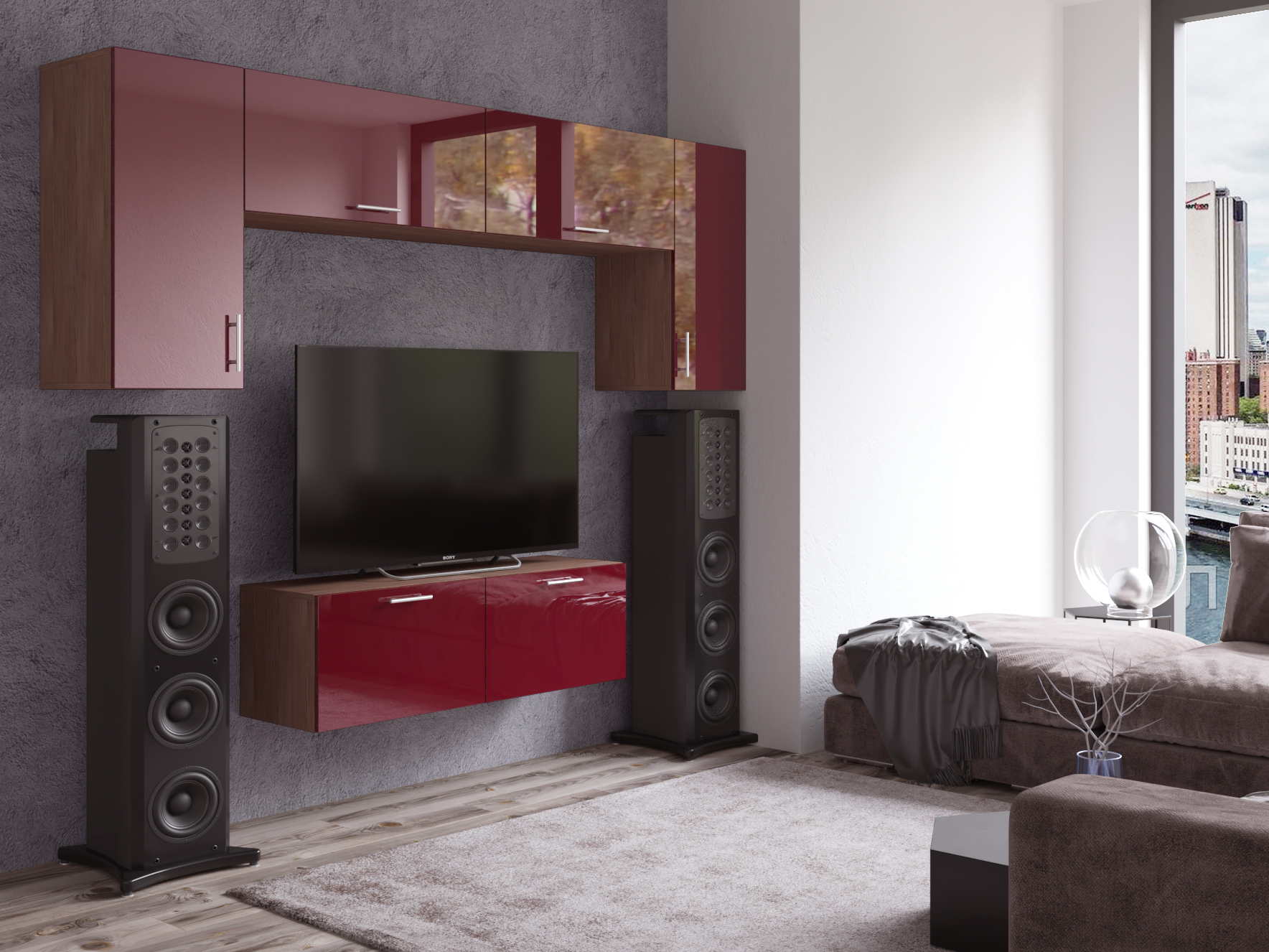 Тумба под ТВ: двери открываются вниз, за каждой дверью 1 отделение. Шкаф навесной вертикальный: за дверью 1 полка. Шкаф навесной горизонтальный: дверь открыватся вверх на газлифтах, за дверью 2 отделения
