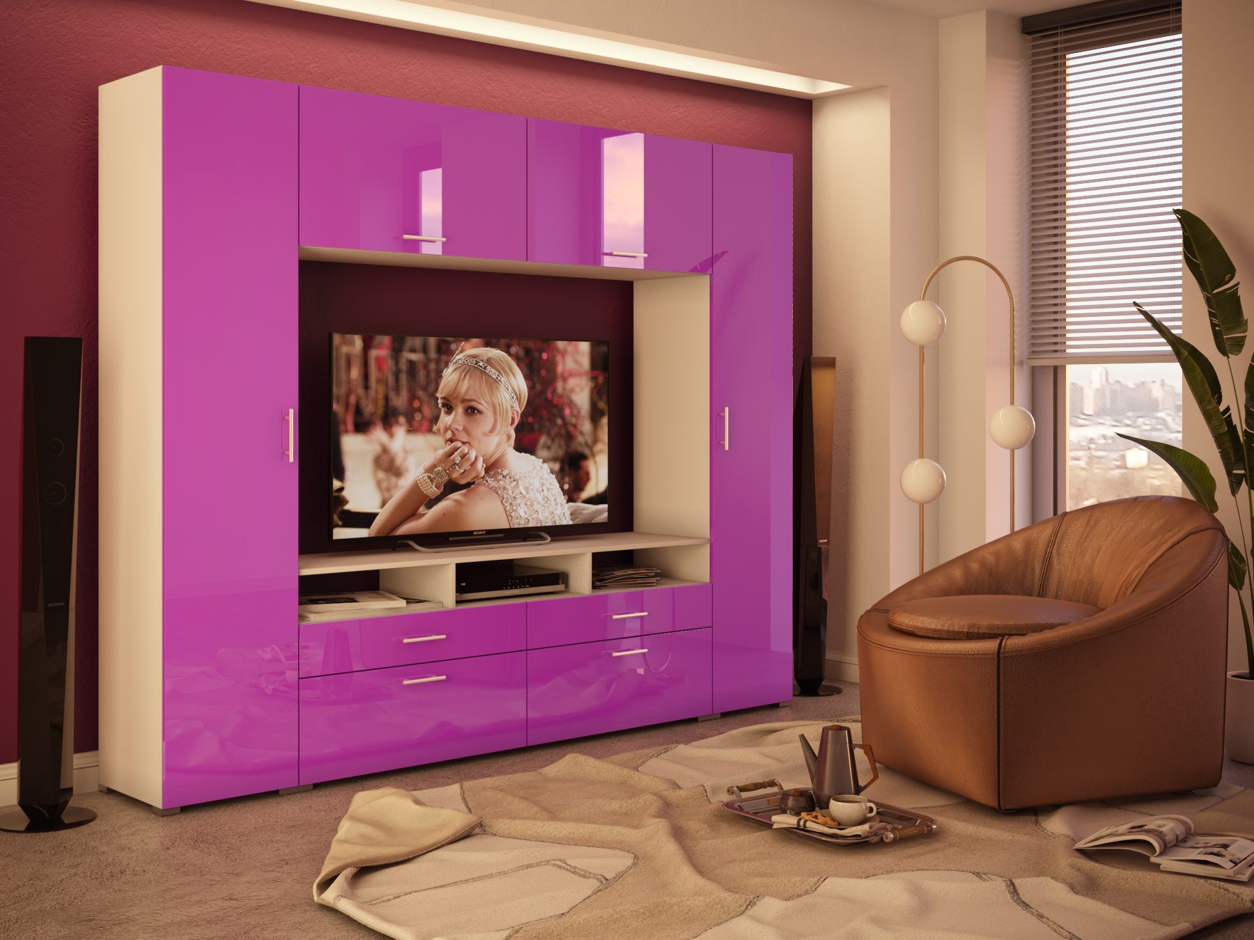 Колонка: белье 4 полки. Тумба под ТВ: 4 выдвижных ящика. Направляющие ящиков шариковые 100% полного выдвижения. Шкаф навесной: двери открываются вверх на газлифтах, за каждой дверью 1 отделение.