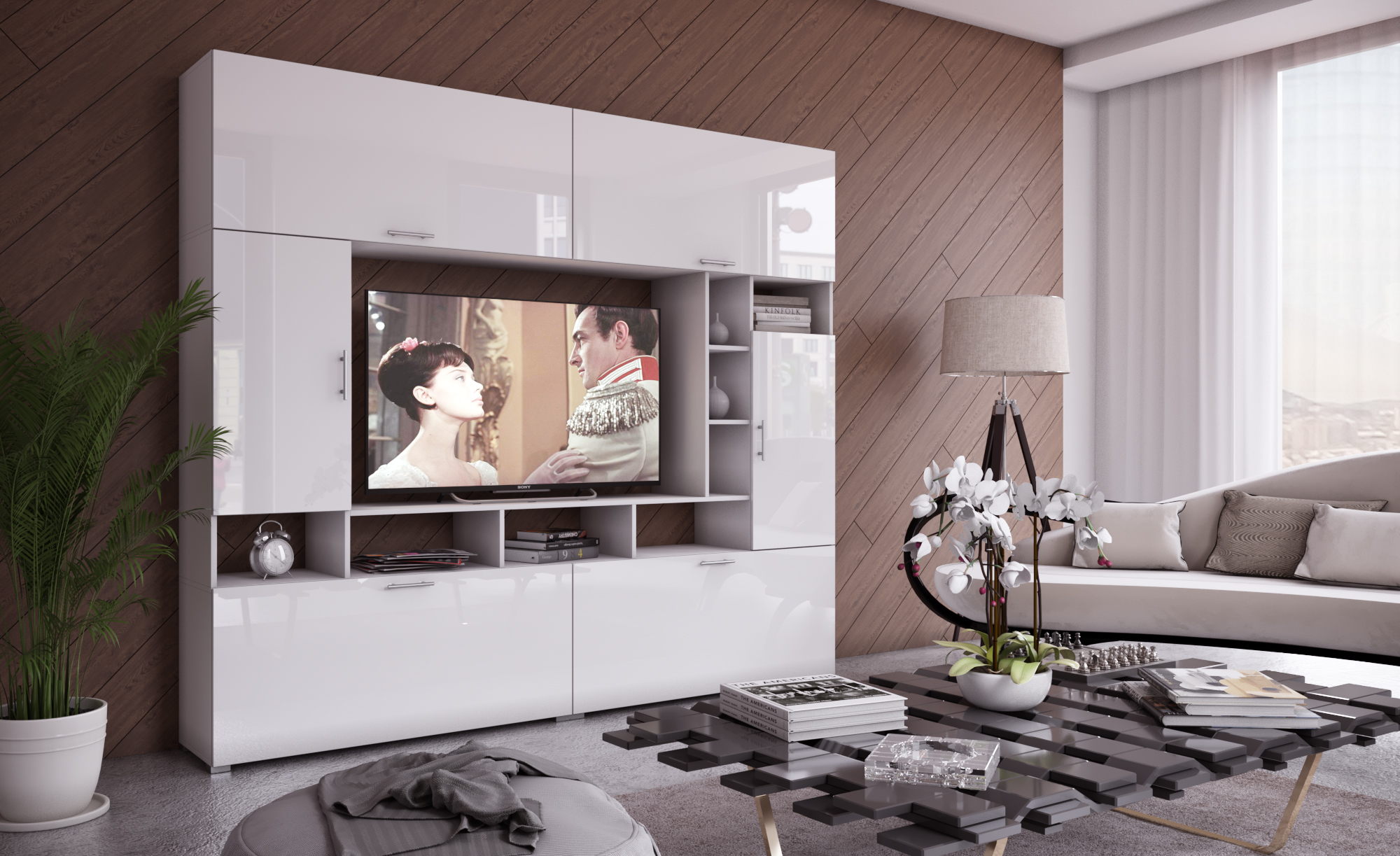 Тумба под ТВ: двери открываются вниз за каждой дверью 2 отделения. Пенал вертикальный: за дверью 1 полка + открытая ниша. Шкаф навесной: двери открываются вверх, за каждой дверью 2 ниши.