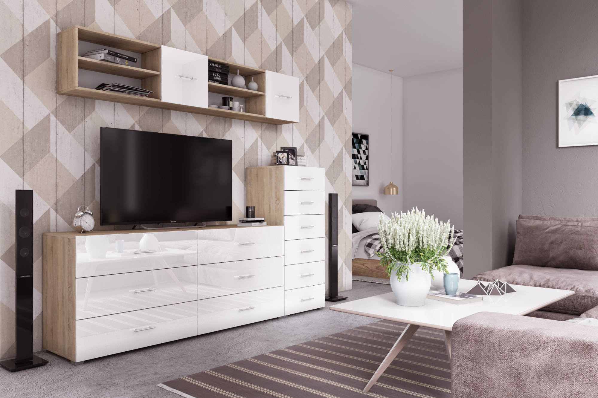 Тумба под ТВ: 6 выдвижных ящиков. Комод: 6 выдвижных ящиков. Направляющие ящиков шариковые 100% полного выдвижения. Шкаф навесной горизонтальный: за распашными дверями по 1 отделению.