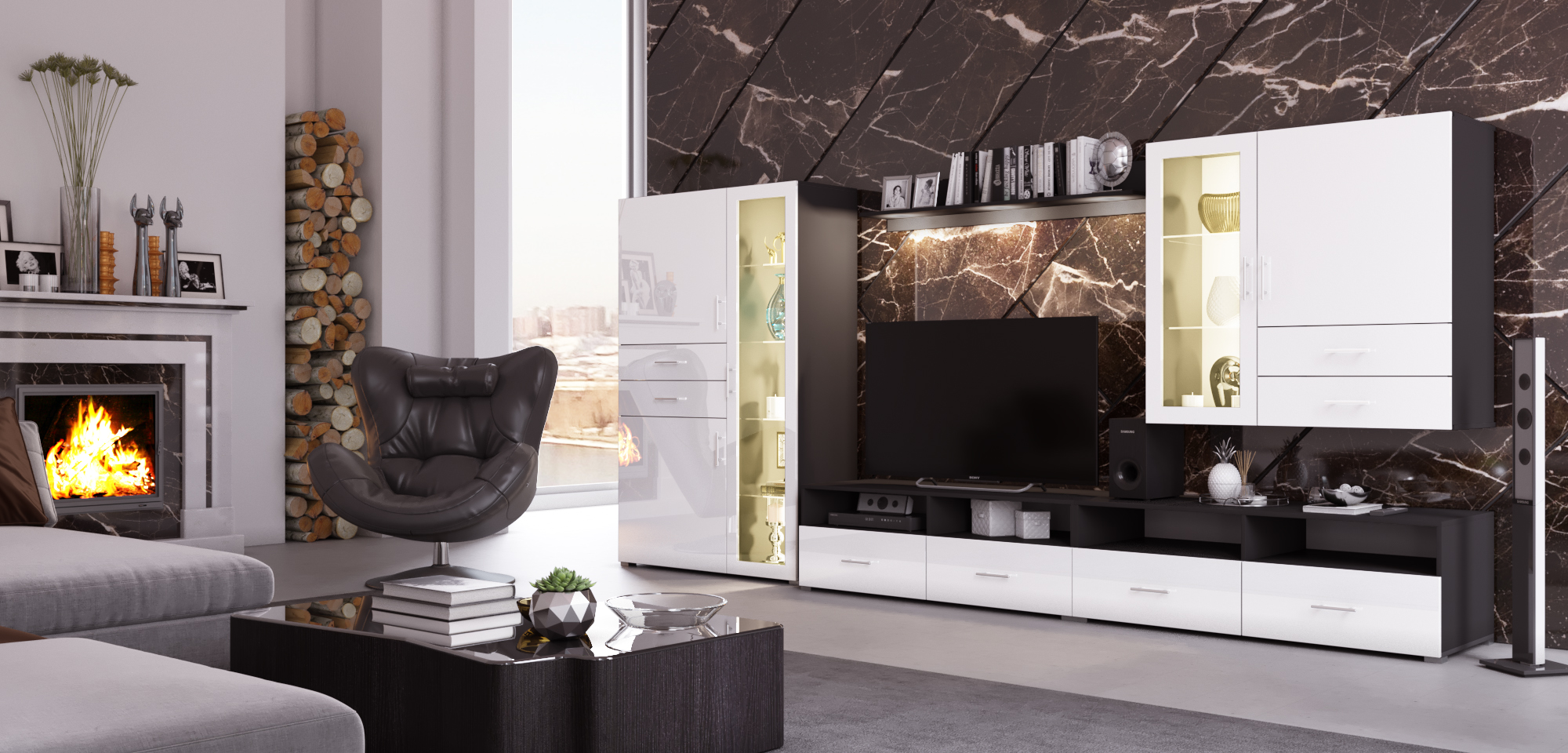 Тумба под ТВ: 4 ниши + 4 выдвижных ящика. Шкаф комбинированный: за дверью со стеклом 4 стеклополки, 2 выдвижных ящика, за глухими дверьми по 1 полке. Шкаф навесной: за стеклянной дверью 2 стеклополки, за глухой дверью 1 полка, 2 выдвижных ящика. Направляющие ящиков шариковые 100% полного выдвижения.