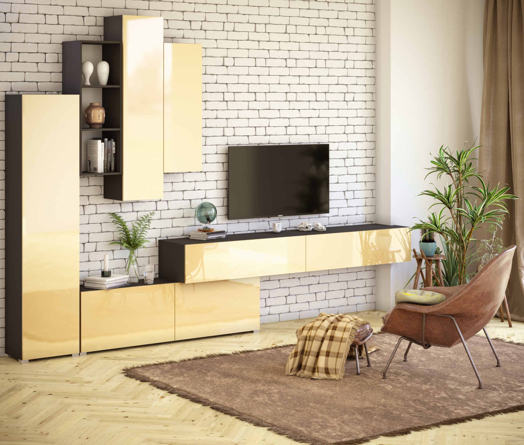 Используемый материал: корпус ламинированное ДСП, фасады МДФ, ламинированные ДВП, стандартная фурнитура. Тумба навесная, двери открываются вниз, наполнение 2 секции. Тумба наполная двери открвываются вниз наполнение 2 секции. Пенал, дверь распашная, наполнение 4 полки. Модуль навесной 1, дверь распашная, наполнение 4 полки. Модуль навесной 2, дверь распашная, наполнение 3 полки. Открытие по нажатию push to open.