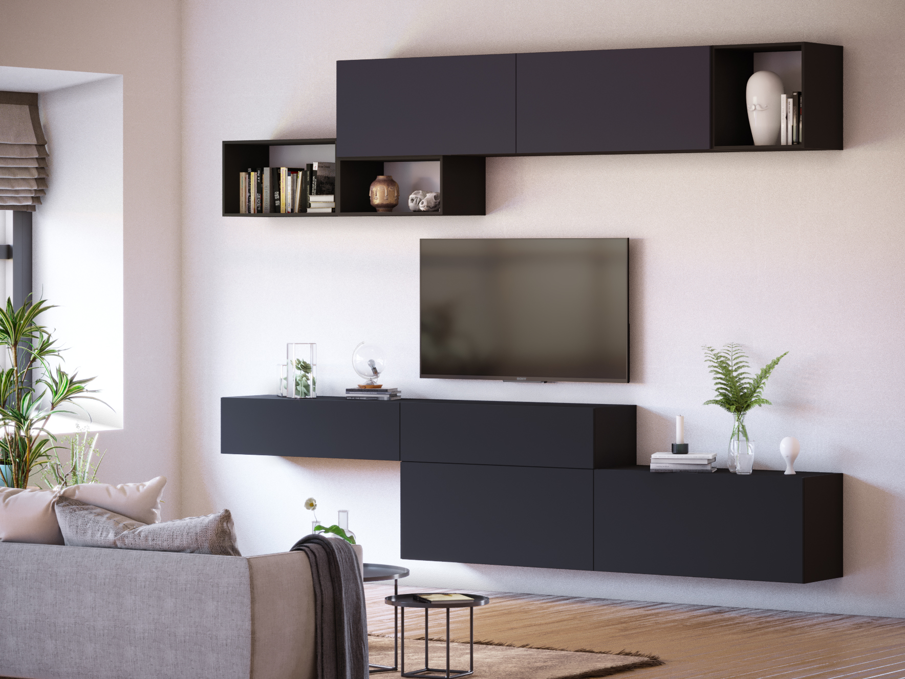 Используемый материал: корпус ламинированное ДСП, фасады МДФ, ламинированные ДВП, стандартная фурнитура. Тумба навесная №1: наполнение 2 выдвижных ящика, направляющие ящиков 100% шариковые полного выдвижения. Тумба навесная №2: двери открываются вниз, наполнение 4 секции. Модуль навесной: двери открываются вверх, наполнение 4 секции. Открытие по нажатию push to open.