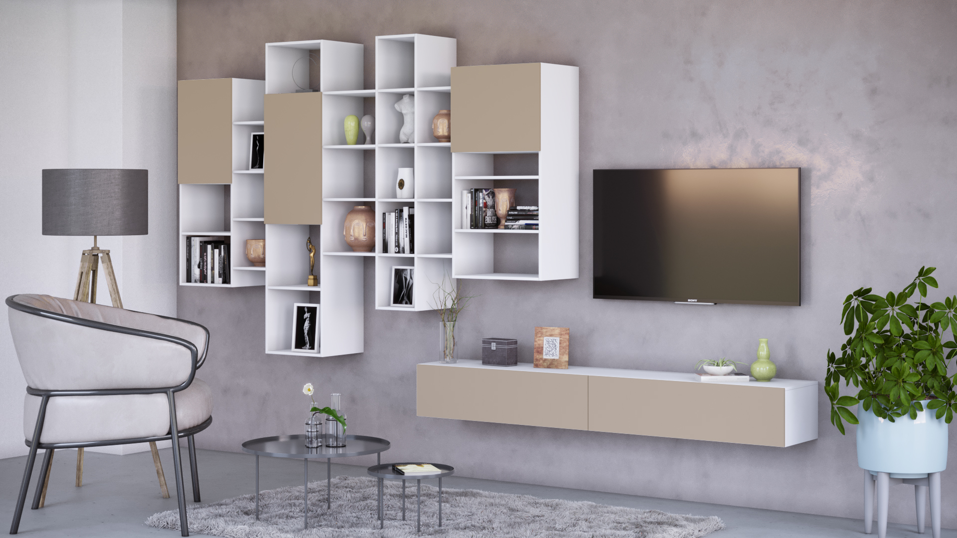 Используемый материал: корпус ламинированное ДСП, фасады МДФ, ламинированные ДВП, стандартная фурнитура. Тумба навесная: двери открываются вниз, наполнение 2 секции. Модули навесные №1 и №2: дверь распашная, за дверью по 1 полке. Открытие по нажатию push to open.