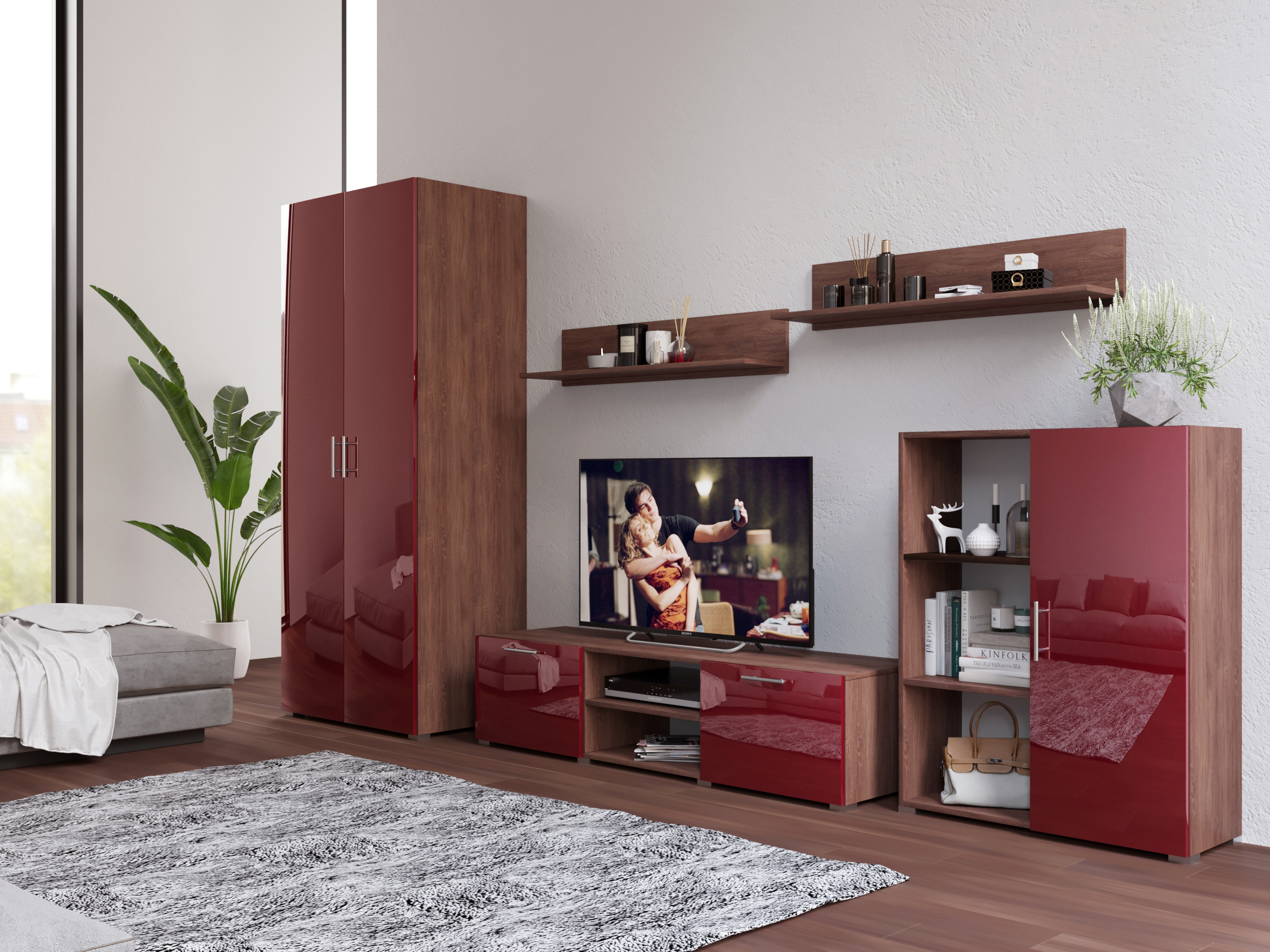 Шкаф распашной 2-х дверный: полка сверху + штанга. Шкаф стеллаж напольный: за распашной дверью 3 полки. Тумба под ТВ: 2 выдвижных ящика, направляющие роликовые.