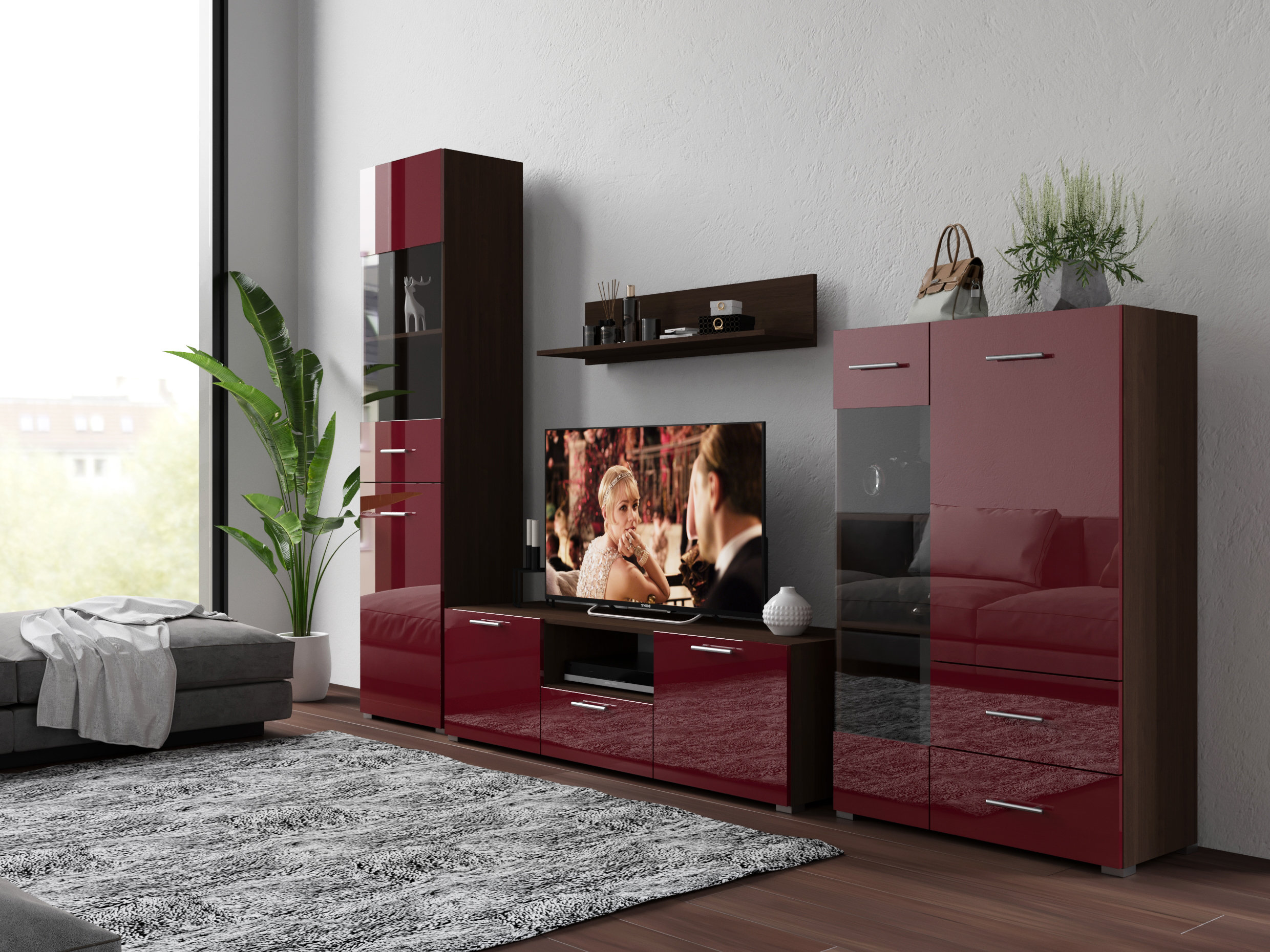 Шкаф пенал витрина: за каждой дверью 2 полки. Тумба под ТВ: 1 выдвижной ящик, направляющие роликовые. Крайние двери открываются вниз на барных кронштейнах. Комод: 2 выдвижных ящика, направляющие роликовые. Слева за дверью 2 полки, справа 1 полка.