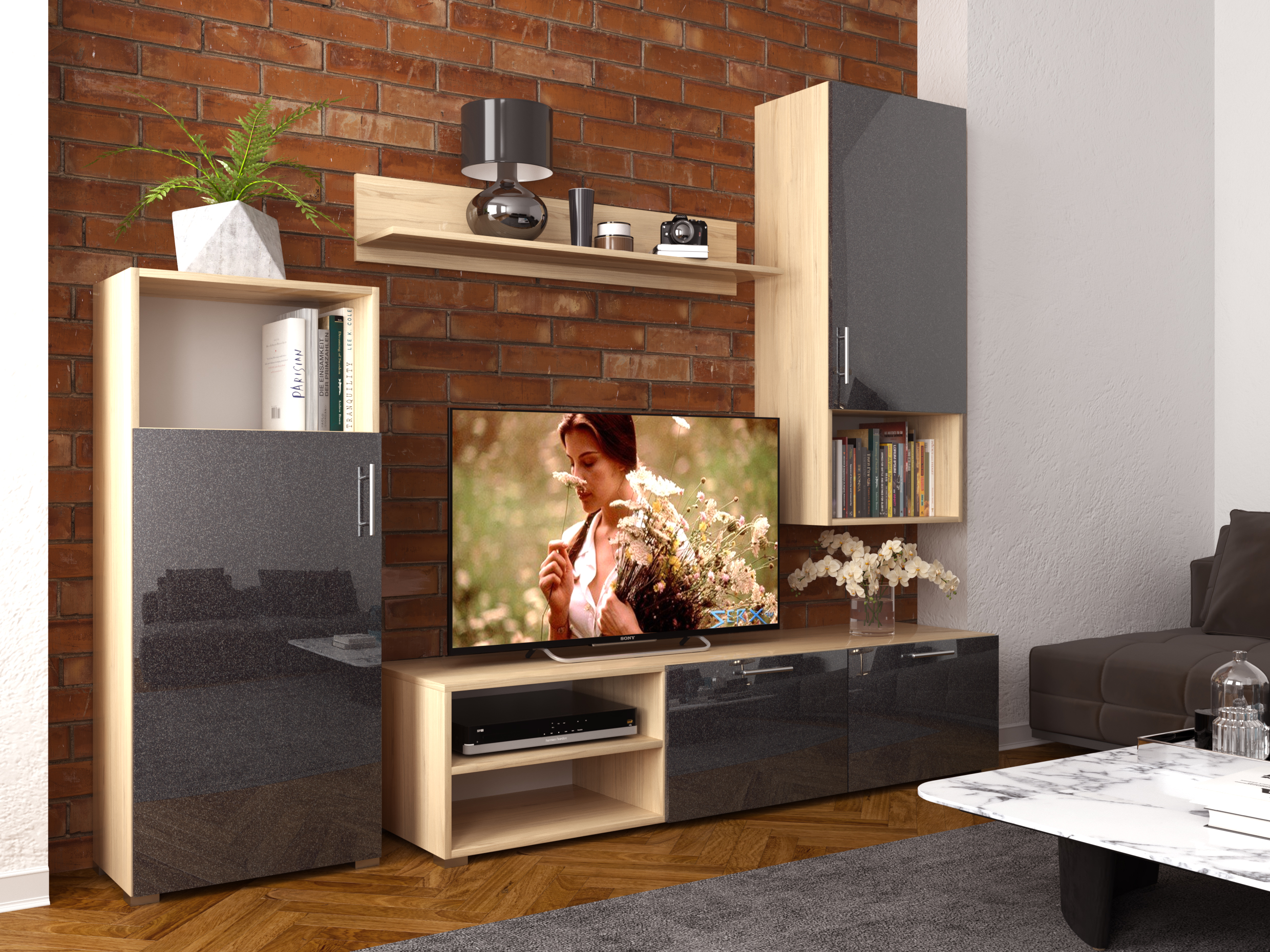 Шкаф напольный: 2 полки + ниша. Шкаф навесной: 2 полки + ниша. Тумба под ТВ двери открываются вниз на барных кронштейнах.
