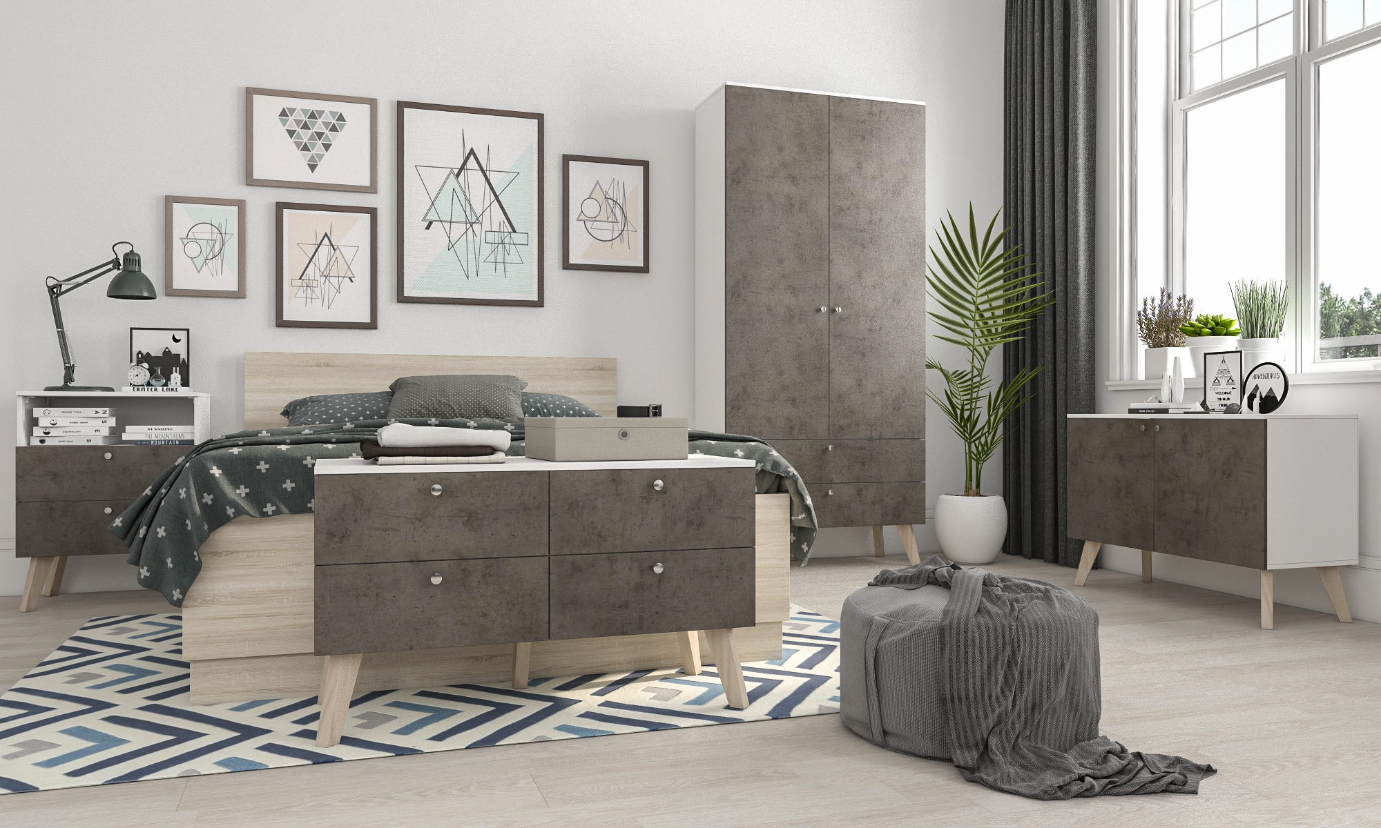 Используемый материал: корпус и фасад изготовлен из ЛДСП. Комод распашной: за дверьми перегородка в каждом отделении 2 полки. Шкаф распашной 2 выдвижных ящика, за распашными дверями платье (ППШ + штанга) Материал ножек - бук (массив дерева). Высота ножек 200 мм.