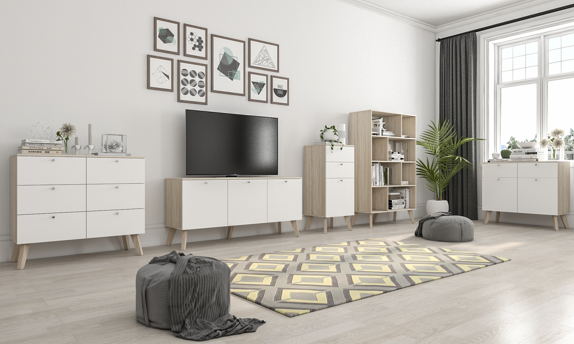 Используемый материал: корпус и фасад изготовлен из ЛДСП. Тумба ТВ: 3 двери - распашные, за дверьми 1 полка. Комод высокий: 2 выдвижных ящика, снизу дверь распашная, за дверью 1 полка. Комод: 2 выдвижных ящика, за распашными дверями перегородка, в каждой секции - 1 полка. Материал ножек - бук (массив дерева). Высота ножек 200 мм.
