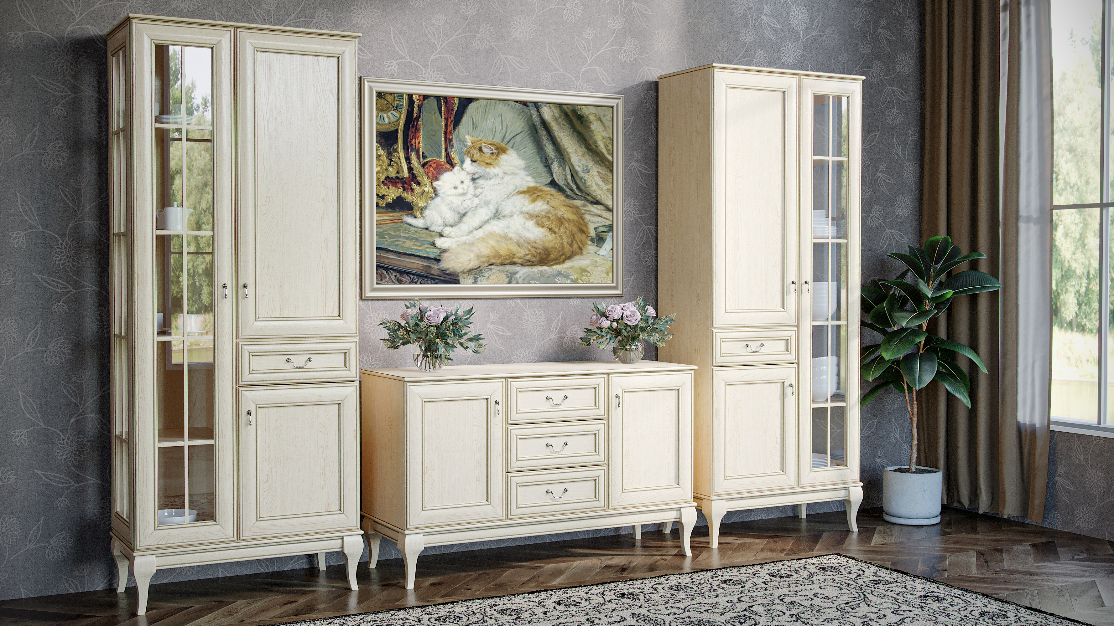 Для аристократичной гостиной идеальным решением станет серия мебели МК 62. В ней представлены различные по комплектации шкафы, горки, комоды, тумбы, буфеты. В качестве цветового решения для отделки фасадов можно выбрать светлый оттенок «дуба седан» или темный «орех». Модульная система позволяет подобрать и купить мебель с учетом планировки и размеров гостиной, а также потребностей живущих в доме. Объемные молдинги на дверцах и ящиках, оригинальные ручки-капли и подвески, высокие ножки в сочетании с нежной фактурой натурального дерева наделяют каждый предмет легкостью и изысканностью, а продуманные конструкции позволяют качественно и рационально организовать пространство гостиной.