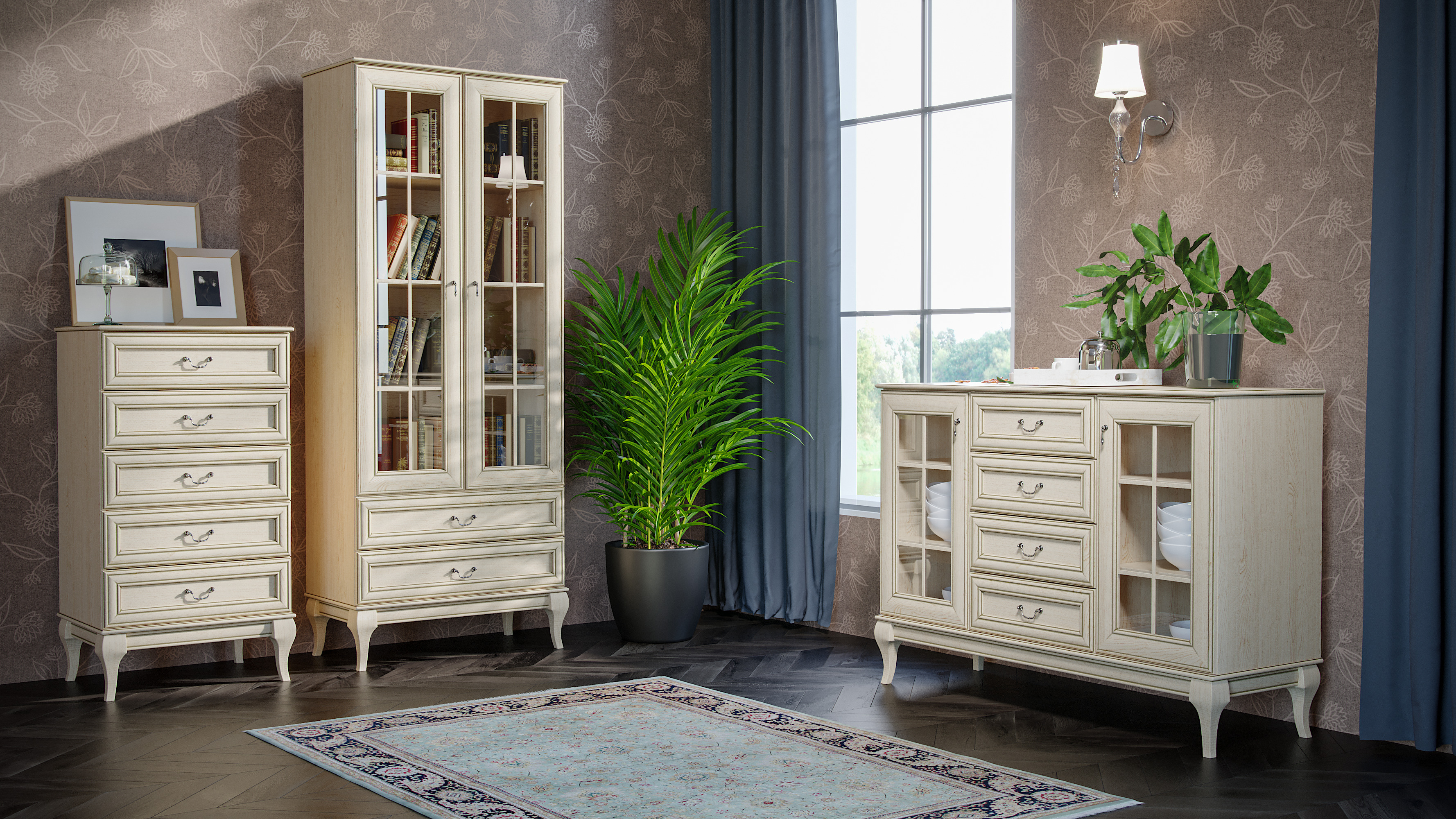 Для аристократичной гостиной идеальным решением станет серия мебели МК 62. В ней представлены различные по комплектации шкафы, горки, комоды, тумбы, буфеты. В качестве цветового решения для отделки фасадов можно выбрать светлый оттенок «дуба седан» или темный «орех». Модульная система позволяет подобрать и купить мебель с учетом планировки и размеров гостиной, а также потребностей живущих в доме. Объемные молдинги на дверцах и ящиках, оригинальные ручки-капли и подвески, высокие ножки в сочетании с нежной фактурой натурального дерева наделяют каждый предмет легкостью и изысканностью, а продуманные конструкции позволяют качественно и рационально организовать пространство гостиной.