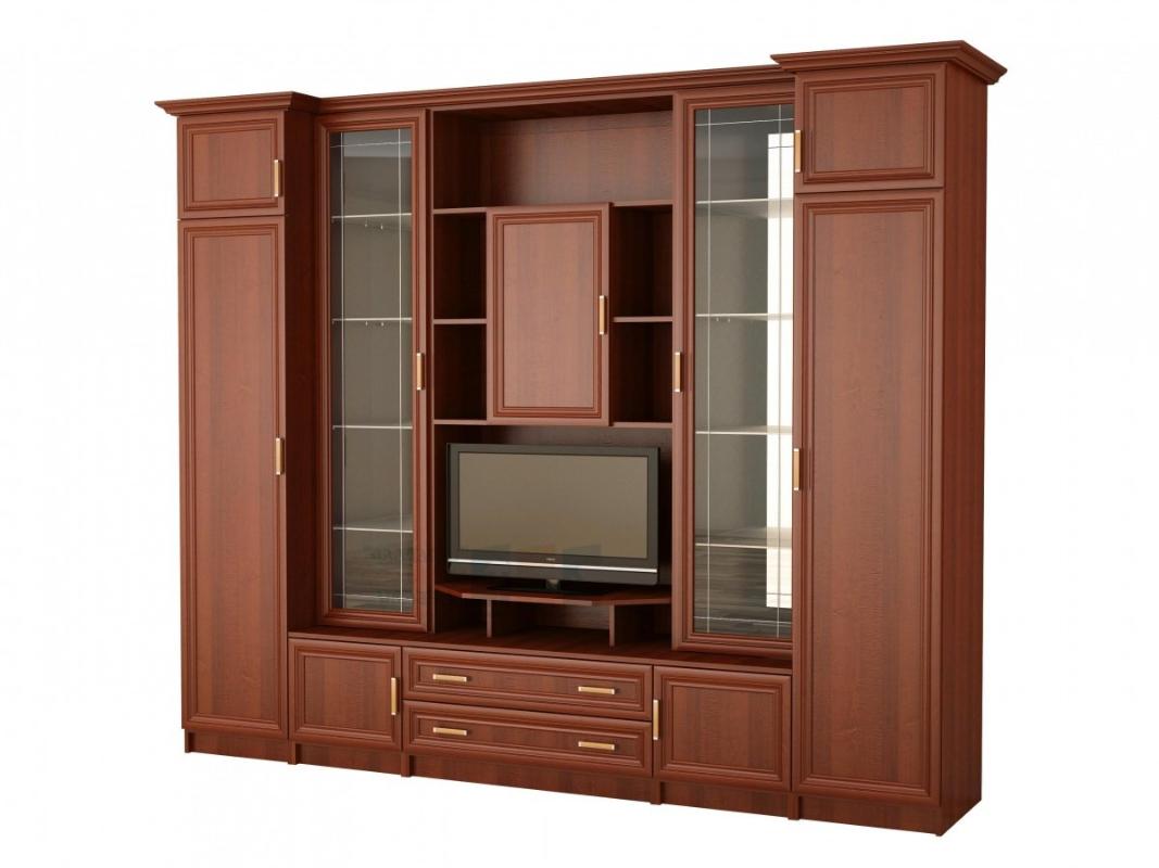 Стенка для гостиной "Марина-10" для гостиной недорого в МосквеСтандартная комлектация: ламинированное ДСП, фасады МДФ рамка, фасадное стекло без витража, стеклополки, кромка 0,4 мм, фурнитура стандартная (без доводчиков), роликовые направляющие. За стеклянными фасадами задняя стенка ЛДВП.